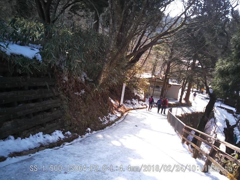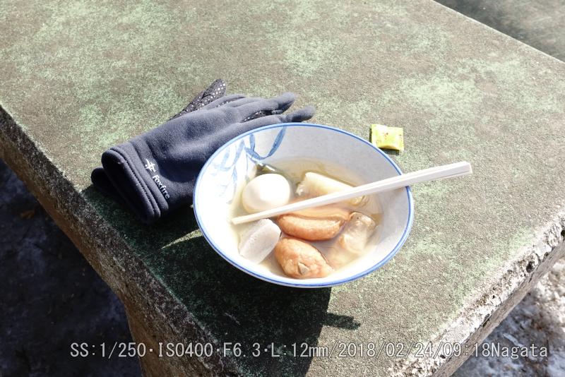 前回の準備不足を補ったのが、高い山はシンドイ。それに雪が昼に溶けて夜は凍ってアイスバーンになってる。アイゼンは7合目ぐらいから装着した。初めての経験だ。頂上付近は雪景色だ。温度計を見ると0℃だった。店で食べたおでんが美味しい。弁当持参のベンチで食べてるグループも居た。登山回数200回を超える強者も居た。