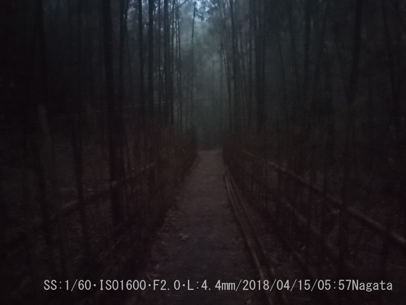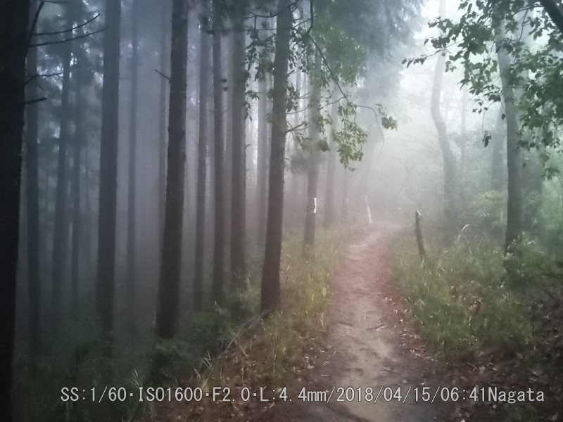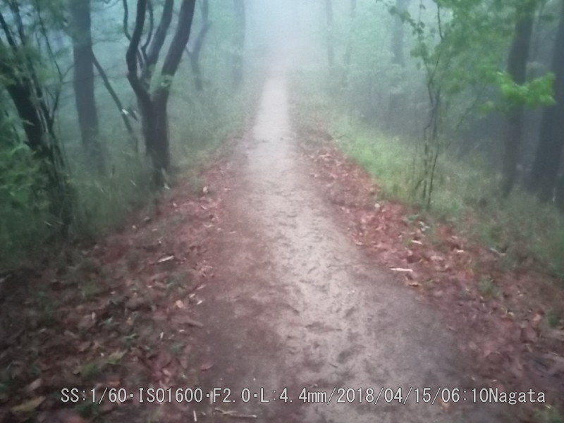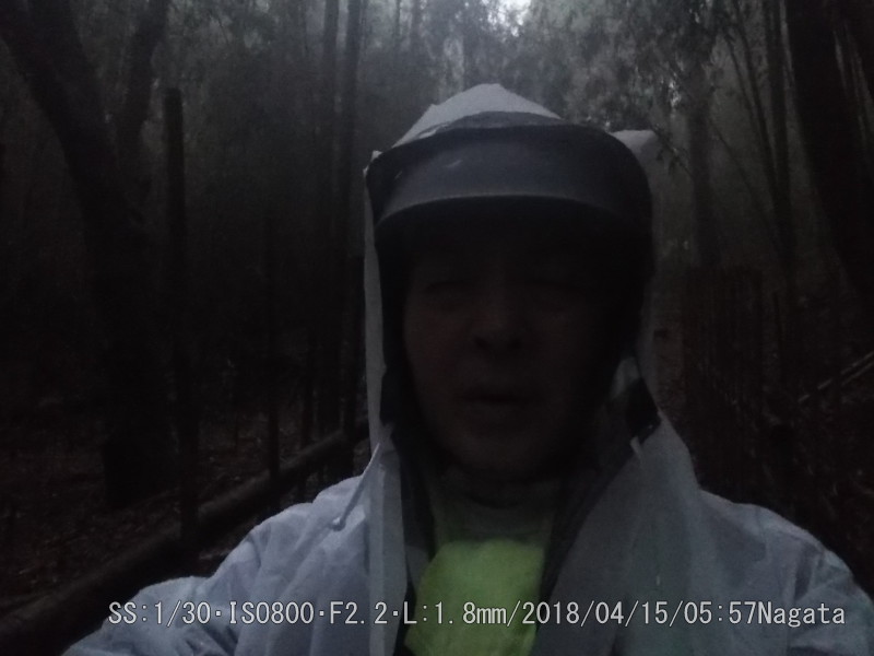 昨日からの雨で、枯れ枝が落ちると危ないのでヘルメット直用。けさも雨は止みそうに無い。途中で合羽呼びを着用した。山へ入ってすぐで大きな木が倒れて道を塞いだ。下を通れるから問題無い。明日にはボランティアで撤去されてると思う。雨と霧だ。