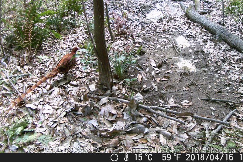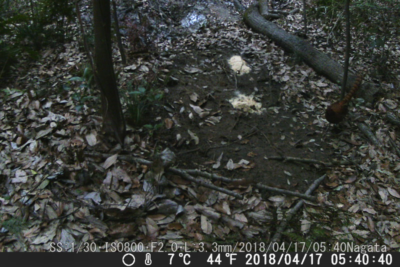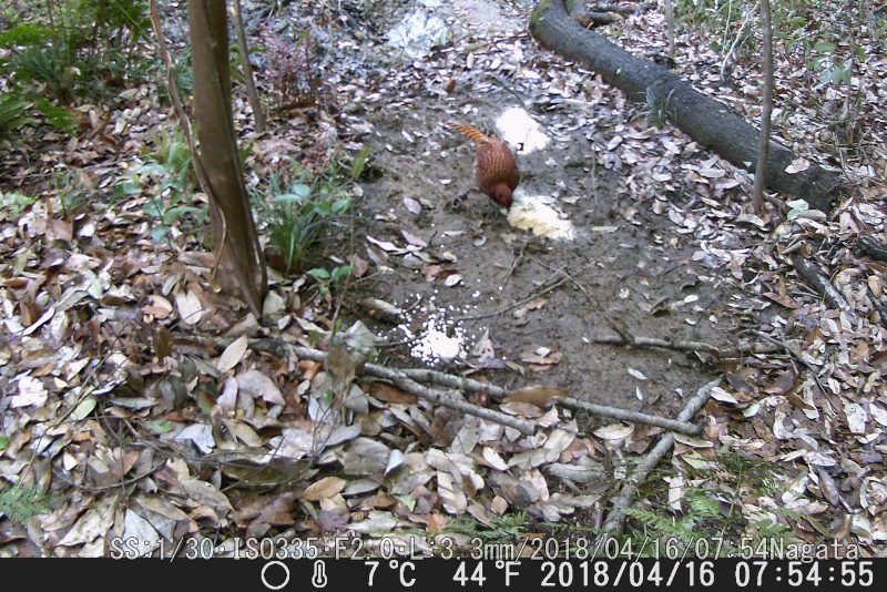 ヌタ場カメラにヤマドリ♂のみ捉えている。糠は食べられて無い。イノシシも全く写ってなかった。ヤマドリは朝8時頃と夕方4時頃だ。珍しく翌朝の夜明け前(薄暗い)時期に来ている。夕方来ても餌は無い。右往左往て感じだ。