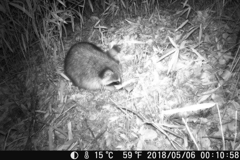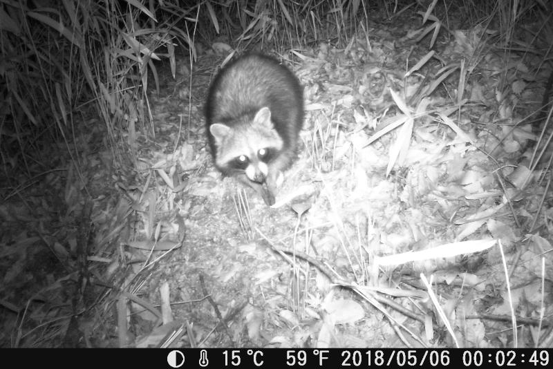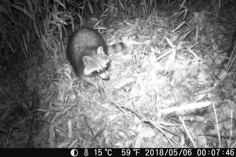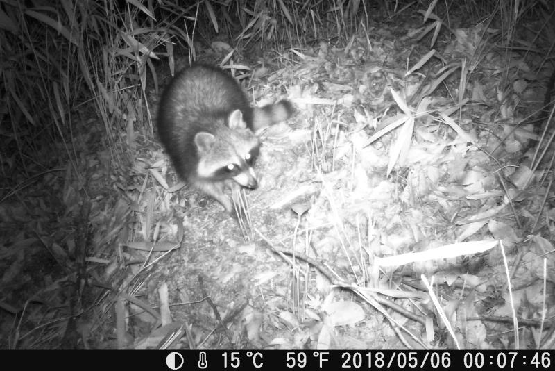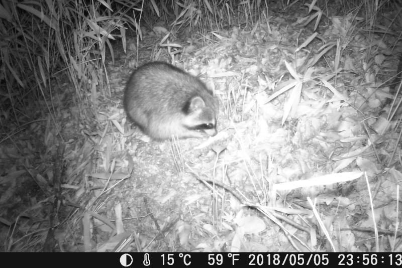 洗い熊。水に手を突っ込んで洗っているように見えるから、アライグマ。本当のようだ。イノシシが糠など餌を食べると土まで荒らして食べる。ところがアライグマが麦を食べた後は荒れて無い。変だと思って画像をよく見ると、数ミリの小粒の麦を丁寧に両手で掴んで1個ずつ食べている。根気が要るなぁ。関心している。トレイルカメラの場所を変えても一番に餌に気付く。鼻が良いのか、パトロールをして餌探しの範囲が広いのか。