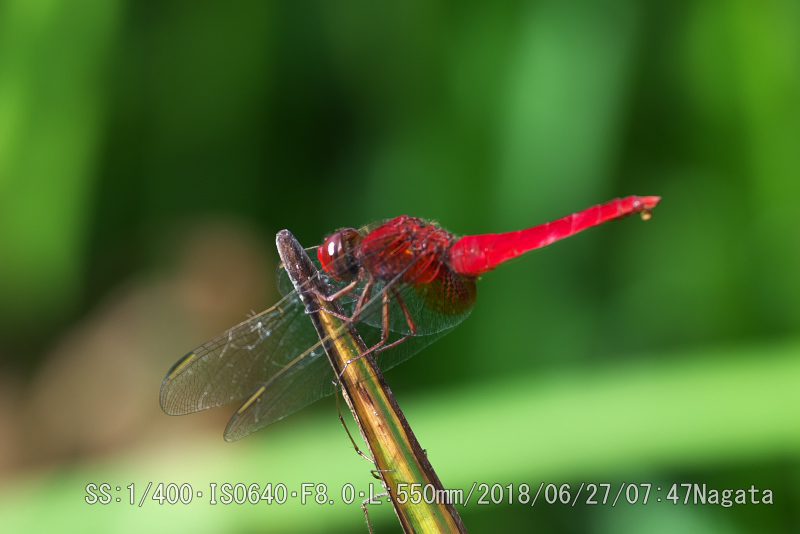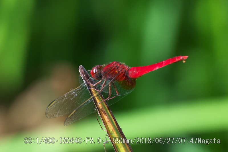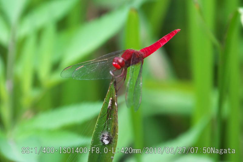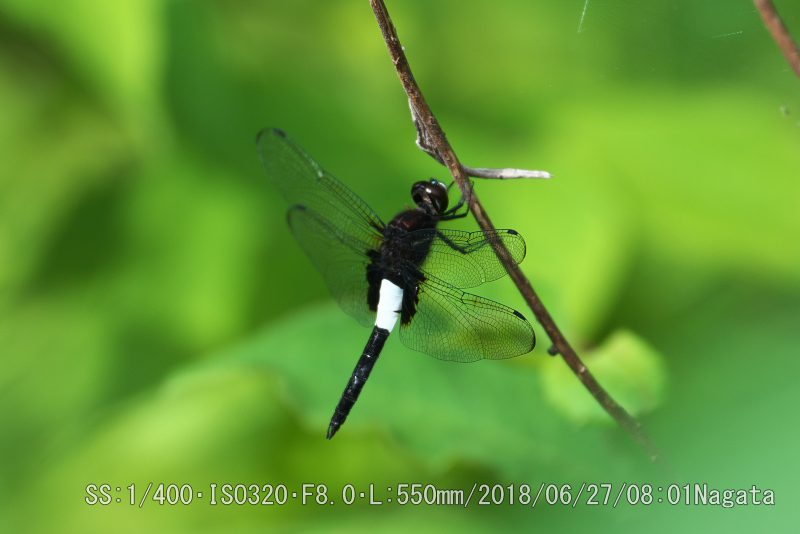 桜池の蓮池。赤とんぼ。何十年ぶりだろう、見たのは。真っ赤な色が印象的なトンボだ。雌はこれほど赤くはならないようだ。アキアカネが翅を身体より少し下げて止まる。この赤が伝説上の怪物“猩猩(しょうじょう)” の赤を思わせるということからショウジョウトンボとも言うらしい。 コシアキトンボ。 全身は黒色で、腹部の白い部分が空いているように見えるために名づけられたようだ。雄だけが白。