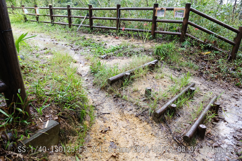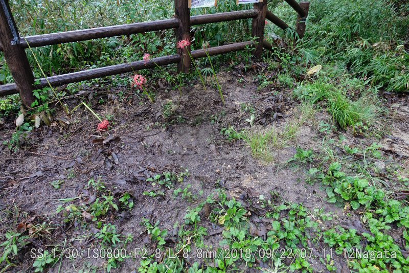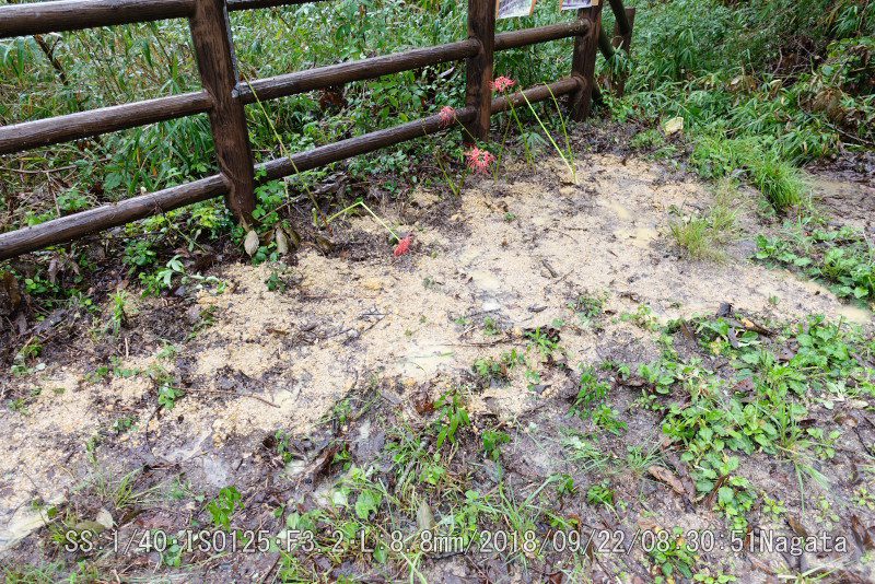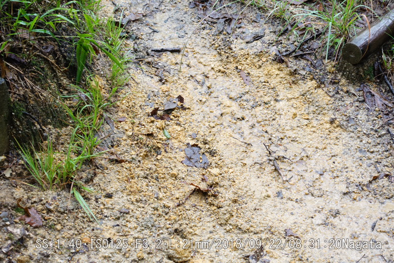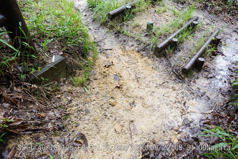 大木の枝が伸びてきているので、日陰になる。土が粘土質だ。植物が育たない。イノシシが掘り返す。悪循環だ。階段付近の流れた土砂を削って持ってきた。幾分改善したかな。そこへイノシシ対策にフタワ 強力忌避一番を点ポイントで数カ所撒いてみた。※臭いが消し炭の臭いだ。隣りに植えてあるヒヨドリバナの蝶へ悪影響無いか心配だ。