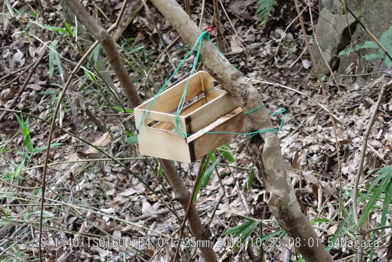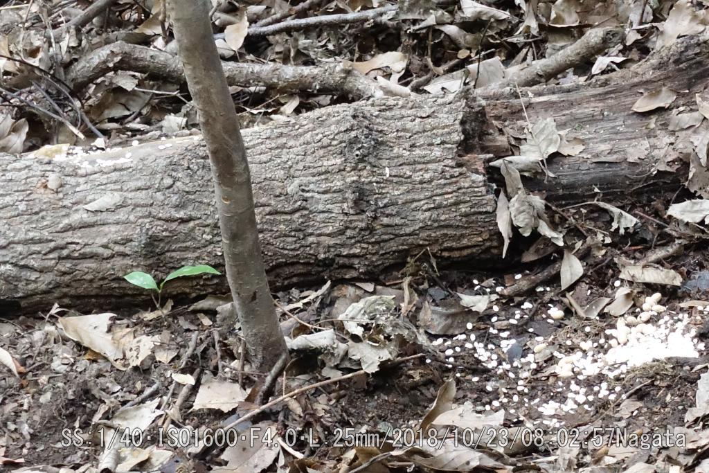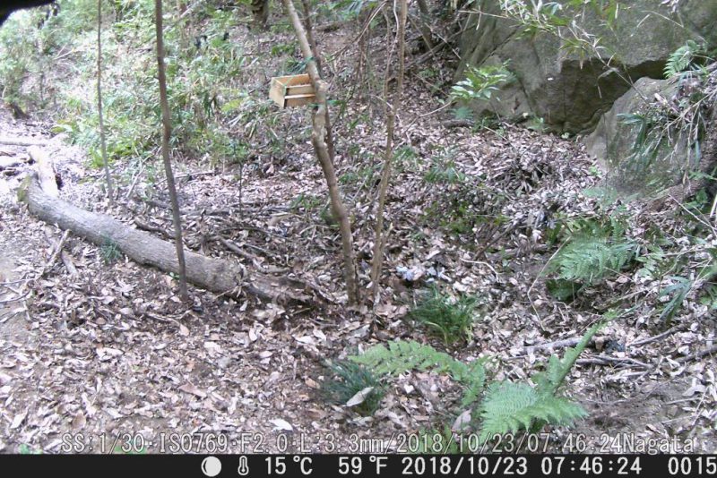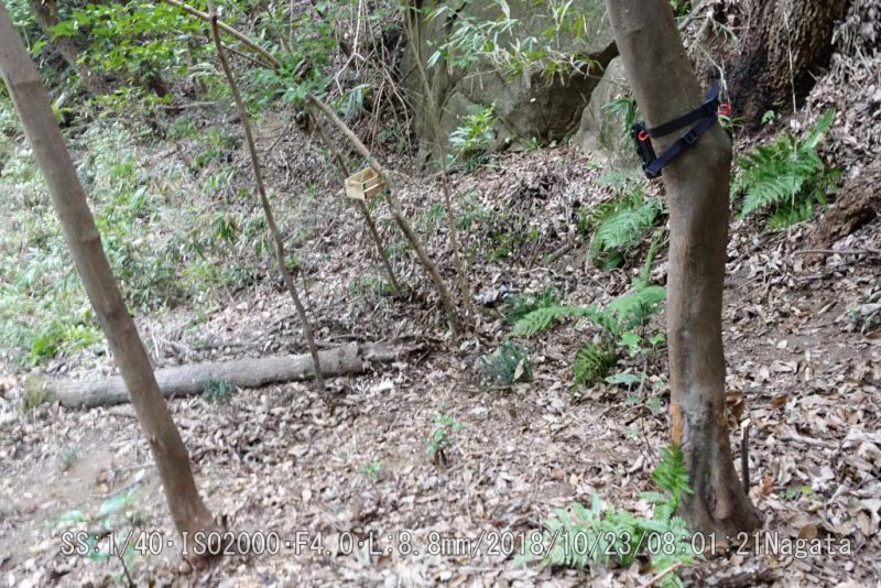 イノシシ(夜間撮影)を諦めて昼間限定した。カメラ設置位置を初期の頃に戻した。下の立木が前の位置だ。トレイルカメラから見た画像。もう少し左へ振ったほうが良さそうだ。ほぼ、左側から被写体が入って来るからだ。リス用の餌箱(百均:200円)麦、大豆を入れた。下の餌はヤマドリ用だ。