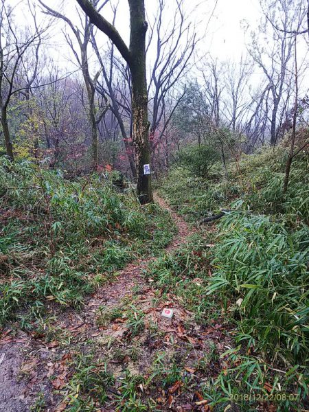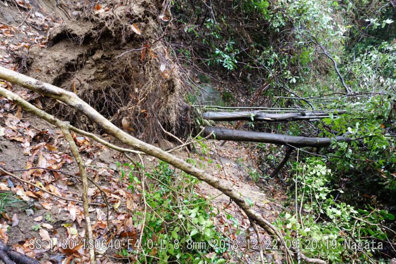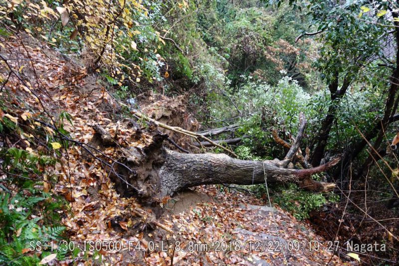 一番の難所。大木を跨ぐ事は出来ないので、左側の山へ一旦上がってから向こうへ抜ける。この道も崖を降りるときに危ない。