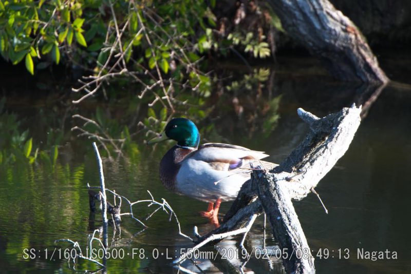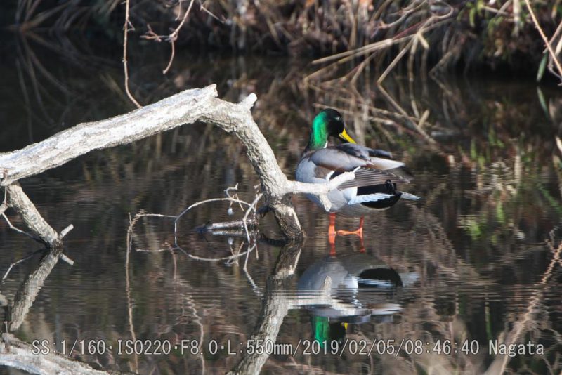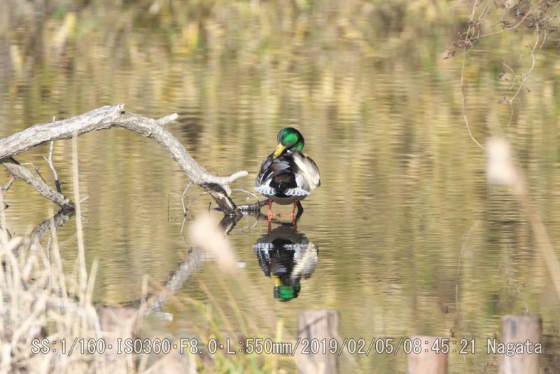 朝陽を浴びて羽づくろいをしてた。明るいので羽根が輝いて綺麗だ。湖面が黄金色に見えた。