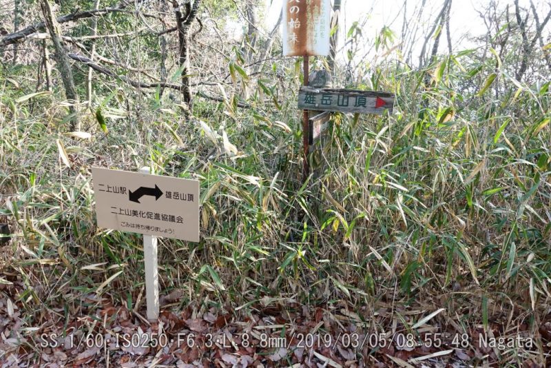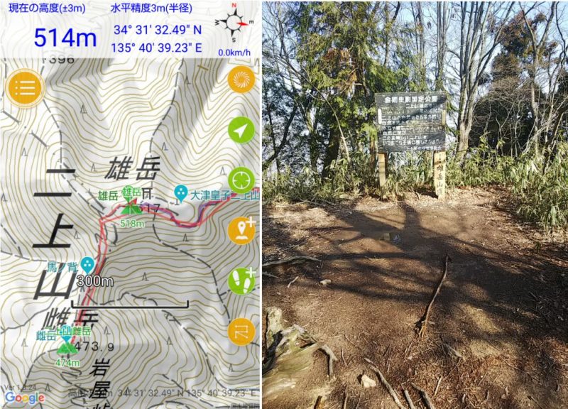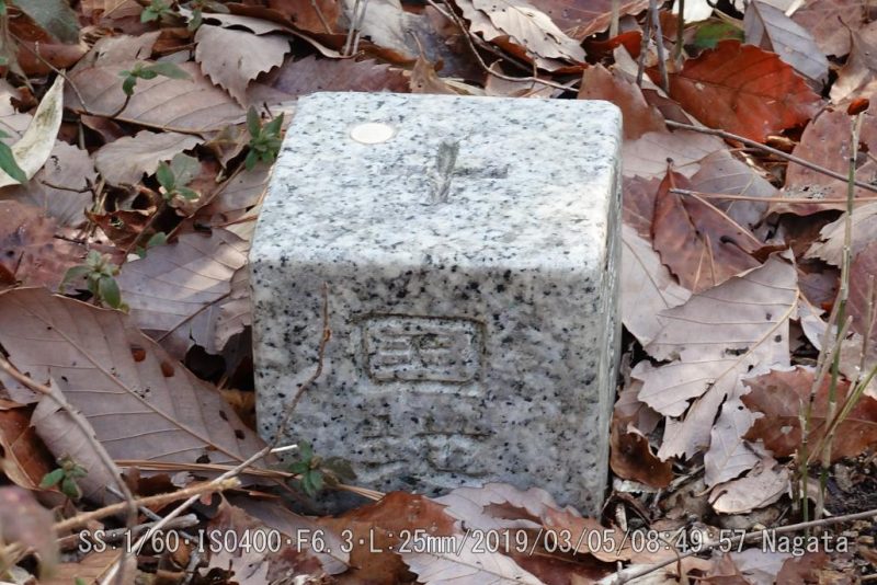 二上山雄岳の三角点は唯一つ、山頂ではなく北側中腹にある四等三角点「滝坪」だ。急な階段を昇りきった6合目のT字路を頂上とは真逆の草むらへ入って、30メータほどすすむと小さな広場の片隅にあった。事前に情報をネットで捜せたから分かった。今回の三角点探しはまずまずだ。でも、疑問も二つ、なぜ滝壺? なぜ頂上から離れた場所に設置?