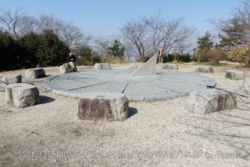 (標高474m) 山頂広場には三等三角点、日時計があった。日時計の影を確認するのを忘れた。