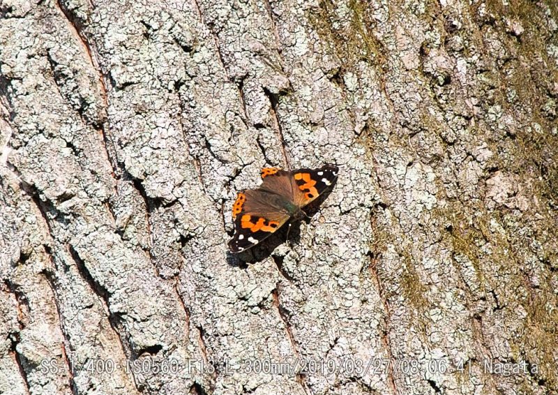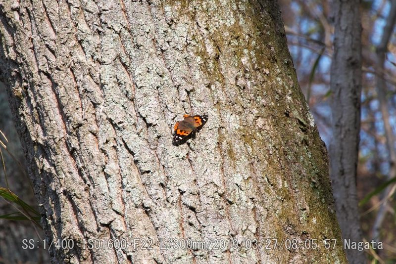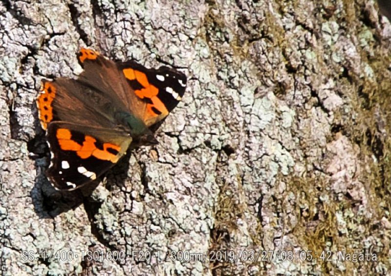蝶と蛾は同じ「鱗翅目」で、蝶は昼に飛び、蛾は夜に飛ぶ?区別するのに最も確実な方法は、蝶の触角はほぼ全種が先が膨らんだこん棒状、一方蛾は、先がとがっているものがほとんどで、中にはくし状とか。辻の新池で飛んでたのが幹に止まった。鮮やかで目を引いた。触覚をアップして上記の条件を当てはめると蝶のようだ。 触覚の先が膨らんでるような