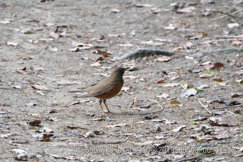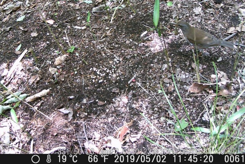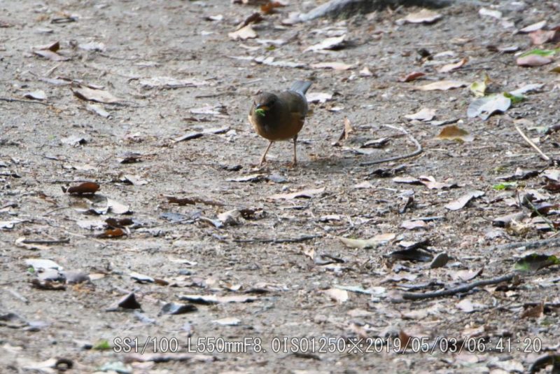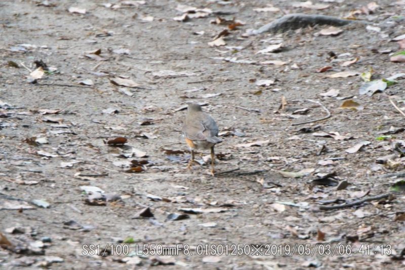 大型ツグミ類。後ろから見てても何か変。お腹辺りが赤っぽい。撮って帰ってから気付いた。シロハラはトレイルカメラにも厄介なぐらい写る。
