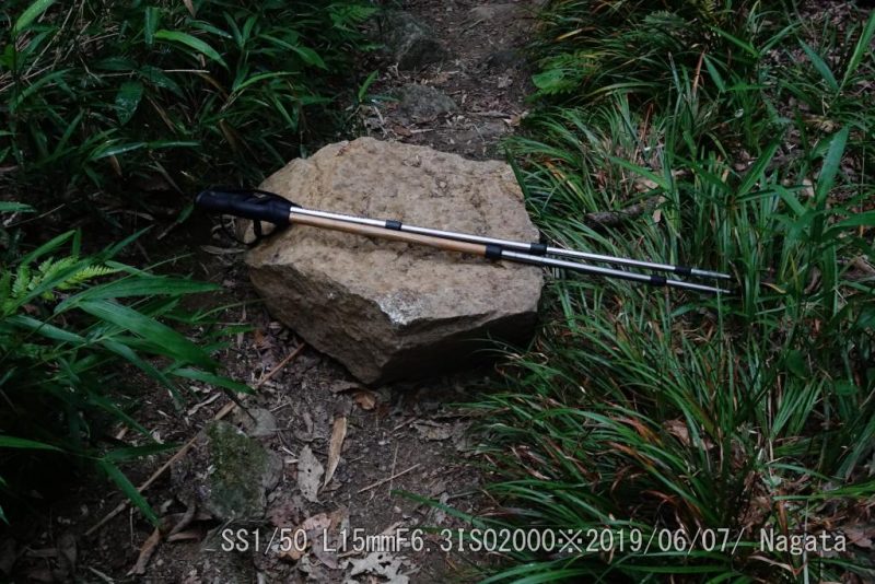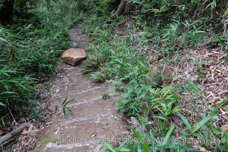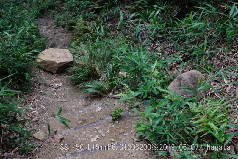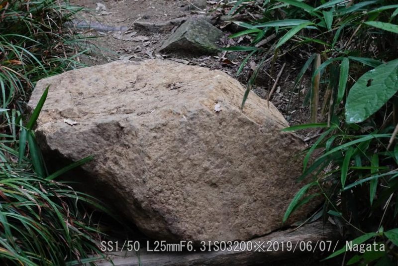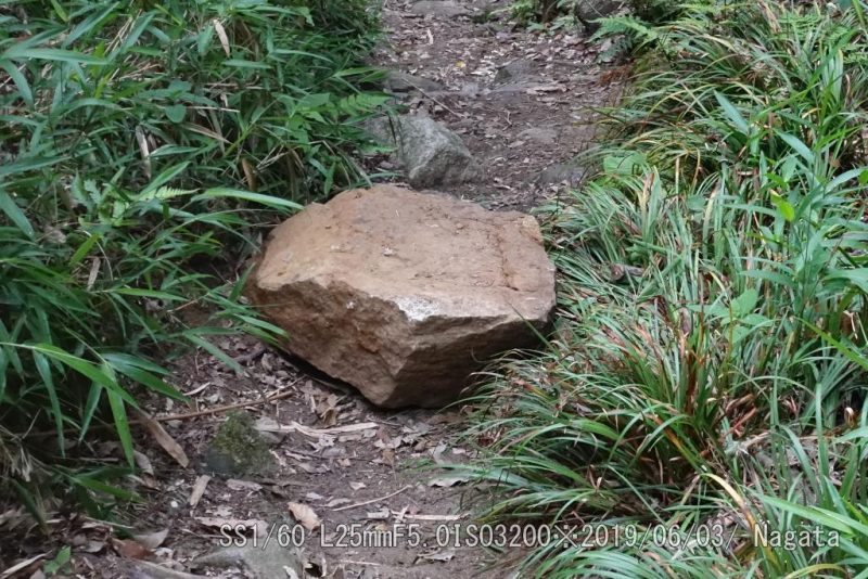 竹林コース登り口の岩場、大きな落石だ。ちょっとやそっとで動かすことが出来ない。6/3に確認してから今朝まで動かした気配がない。跨ぐにも大きいしなぁ。