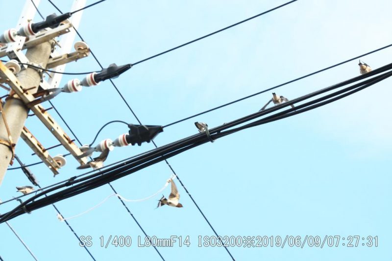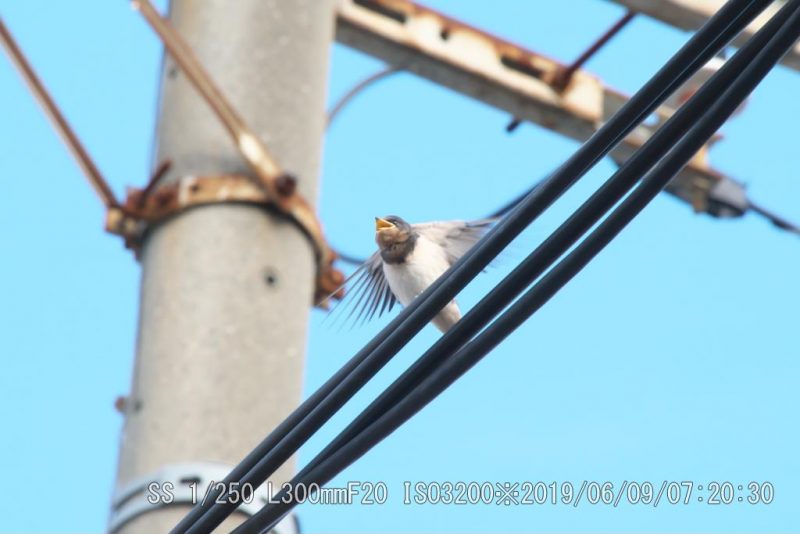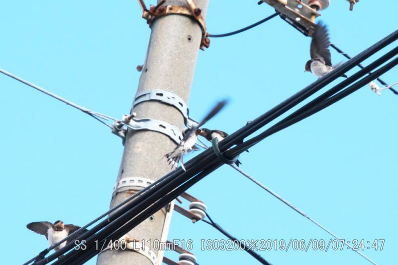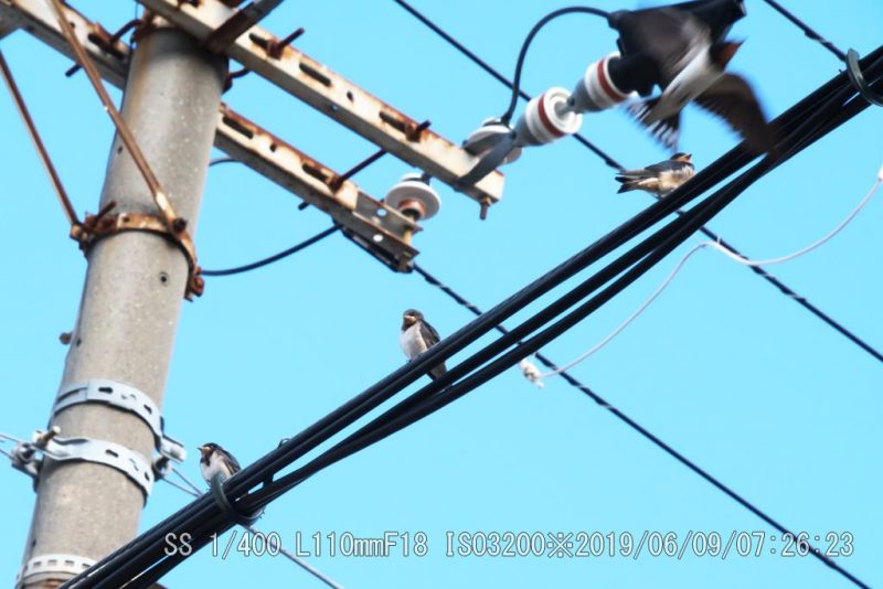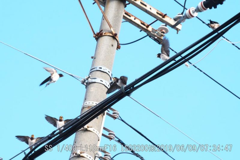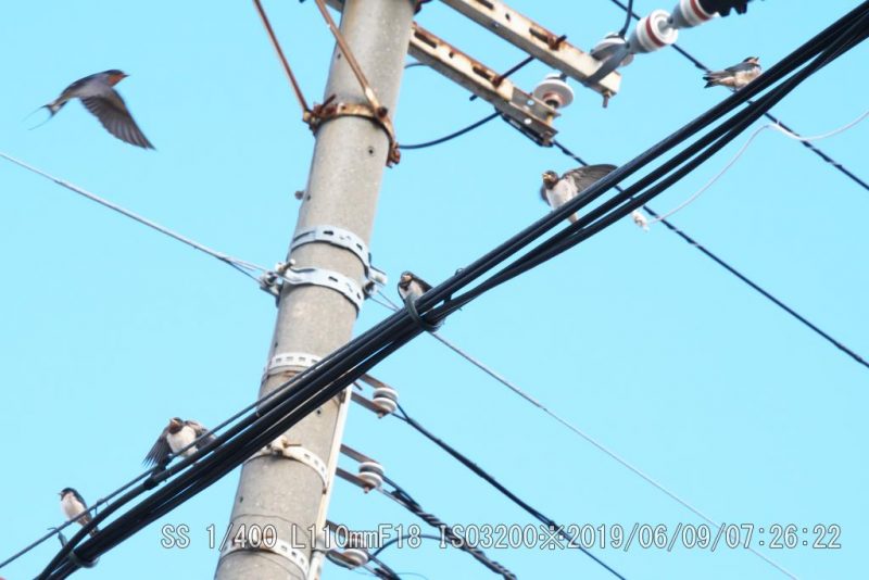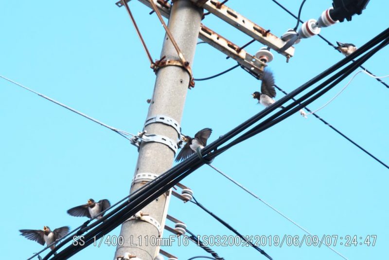 野崎観音さん下の東高野街道にある電柱(電線)に一羽のツバメ、幼鳥が留まっていた。巣立ったばかりのようだ。親が近づくと羽根を広げて餌をねだる。でも、なかなか親は餌をやる気配がなかった。いつの間にかヒナ鳥が5羽になった。親鳥が近づくといっせいに羽根をばたつかせる。不思議なことに、親鳥は一番最初からいた雛に一直線に向かって餌を与えた。一番右端の雛は満腹なのか親鳥が近づいても、あまり反応しなかった。※F値に余裕が有ったので、もう少しSSを上げたら、親鳥もクッキリ撮れたかな。