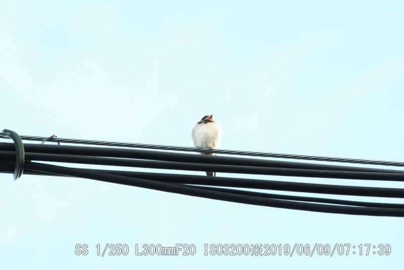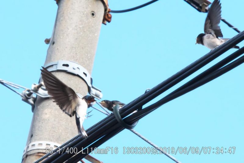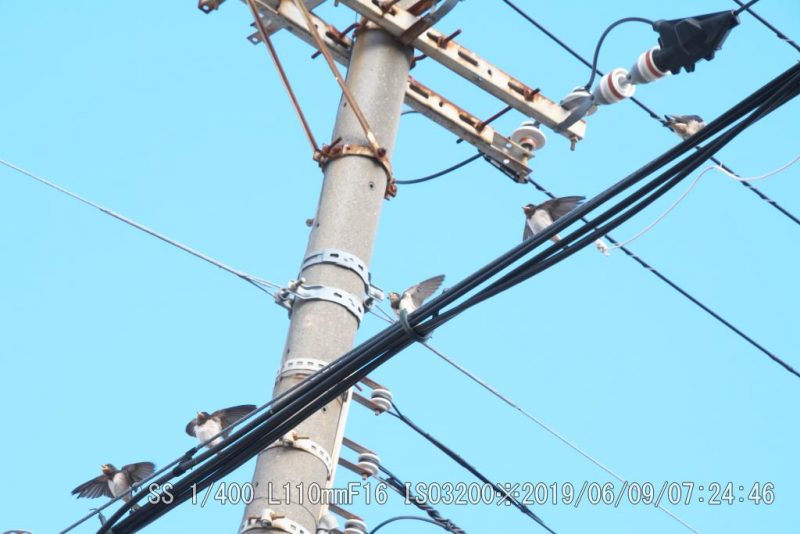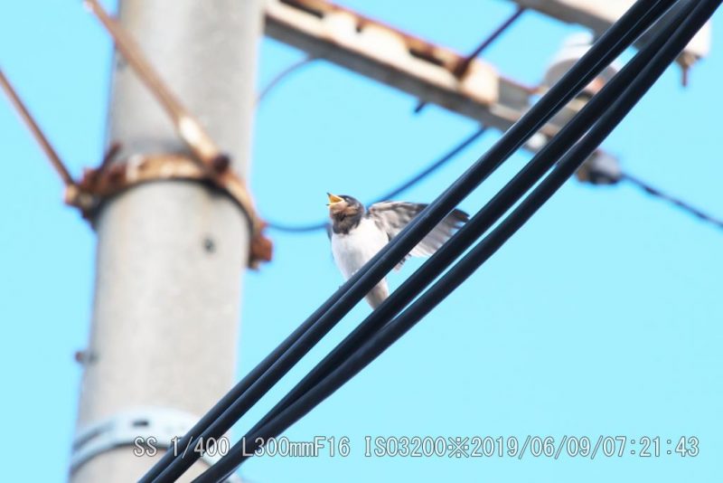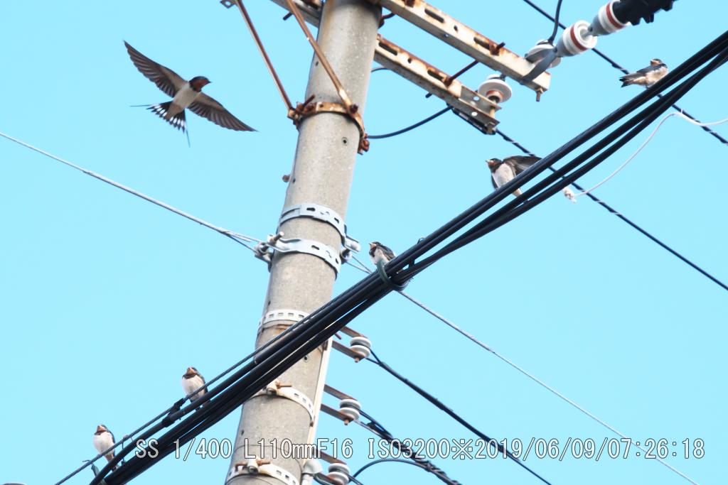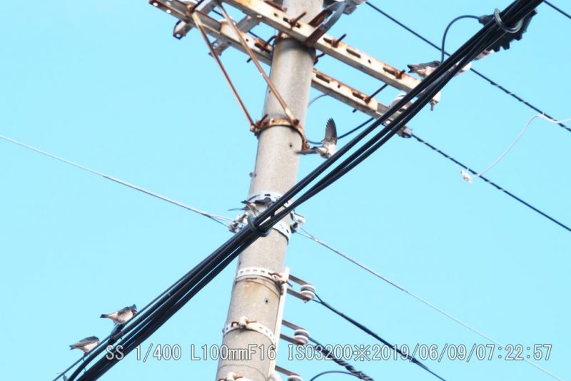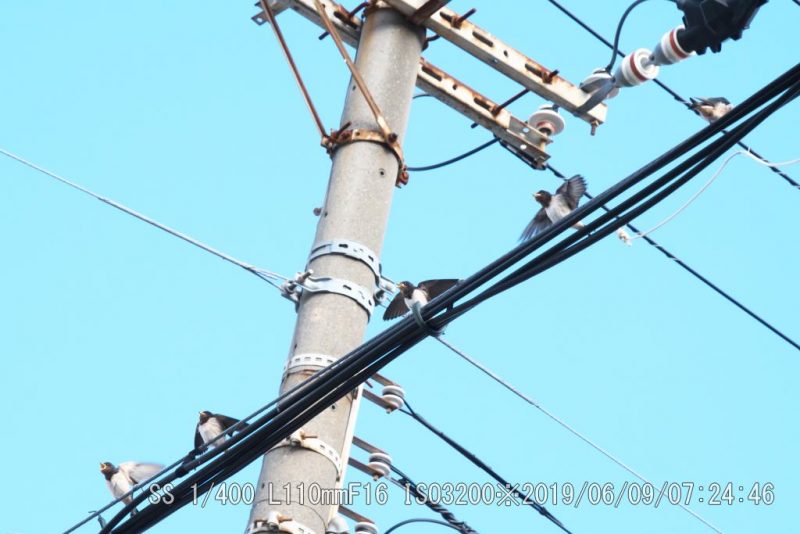 野崎観音さん下の東高野街道にある電柱(電線)に一羽のツバメ、幼鳥が留まっていた。巣立ったばかりのようだ。親が近づくと羽根を広げて餌をねだる。でも、なかなか親は餌をやる気配がなかった。いつの間にかヒナ鳥が5羽になった。親鳥が近づくといっせいに羽根をばたつかせる。不思議なことに、親鳥は一番最初からいた雛に一直線に向かって餌を与えた。一番右端の雛は満腹なのか親鳥が近づいても、あまり反応しなかった。※F値に余裕が有ったので、もう少しSSを上げたら、親鳥もクッキリ撮れたかな。