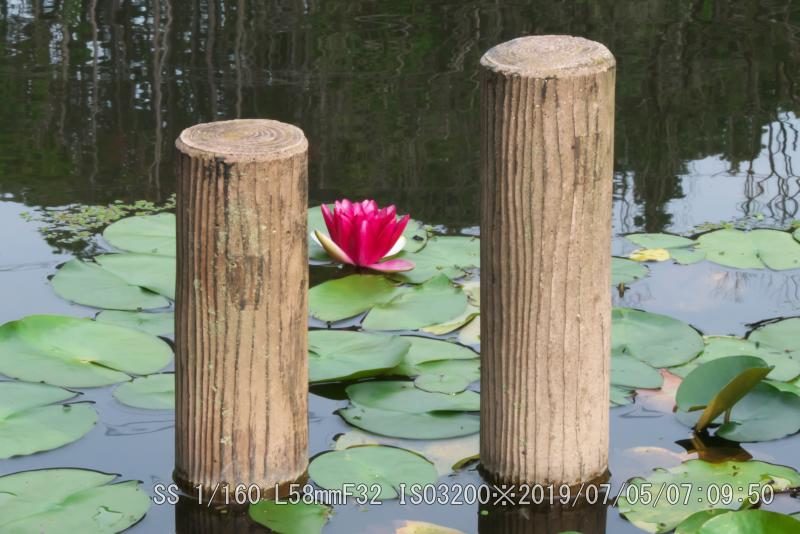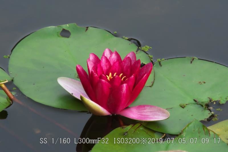 珍しく赤とんぼだ。 翅 が水平だ。アキアカネが翅を身体より少し下げて止まる。しかも時期が違う。池には珍しく赤い色の睡蓮だ。池の隅っこの場所にしか睡蓮は無いが、赤色は初めてだ。