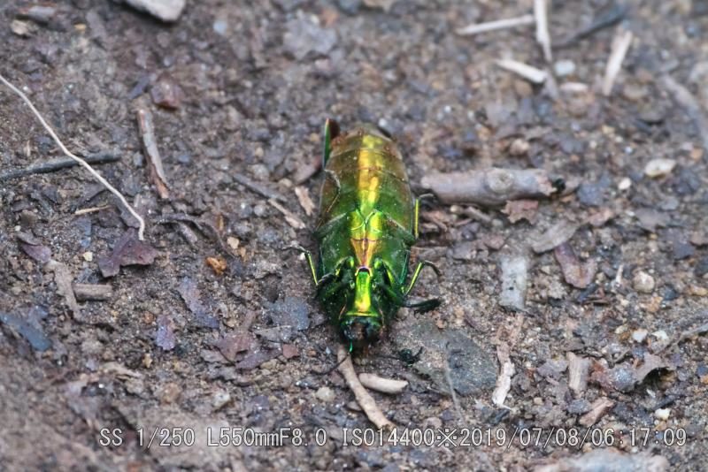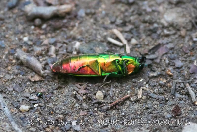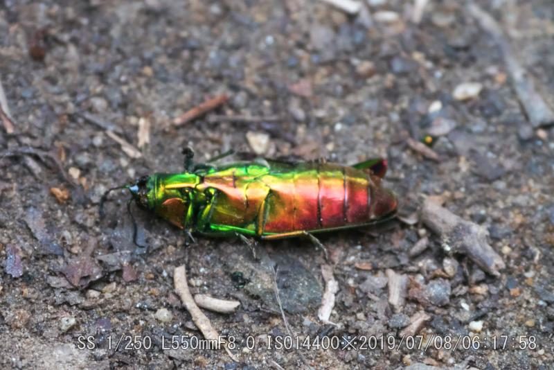 コガネムシと思った。気持ち悪いこともあってピントが許す範囲で近寄って撮った。後に写真で分かったが、どうもお腹側のようだ。ひっくり返すと綺麗なタマムシ色の羽根だったと思うと残念だ。