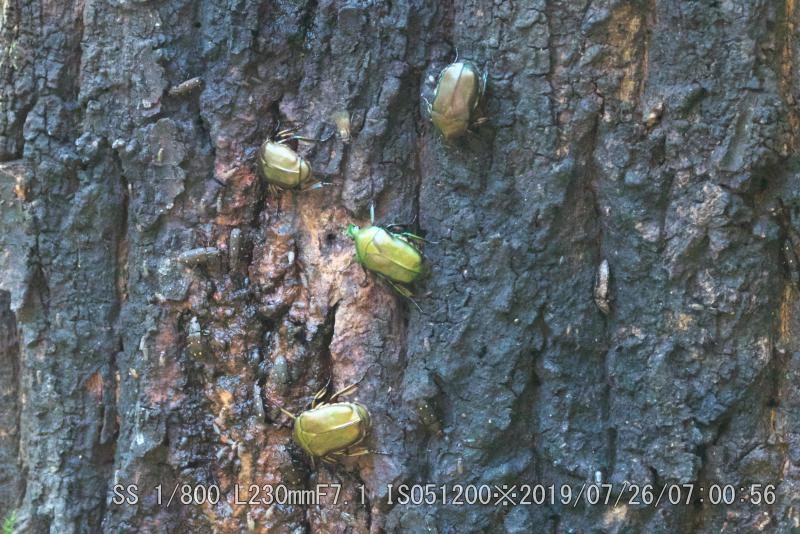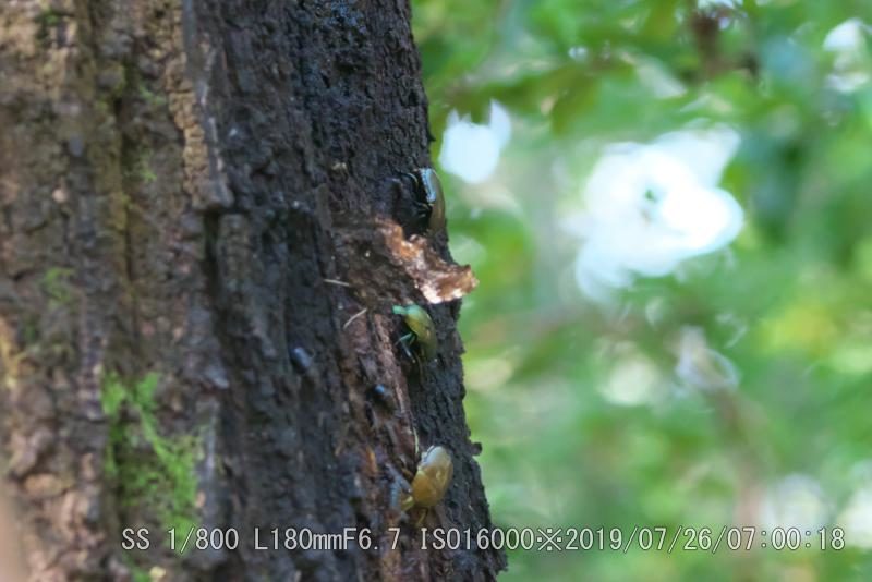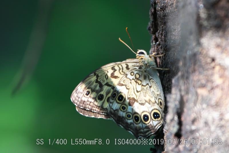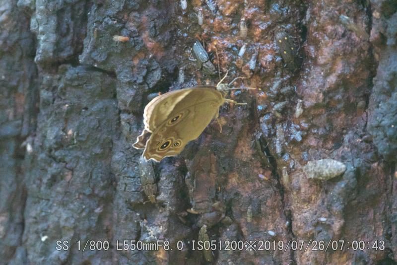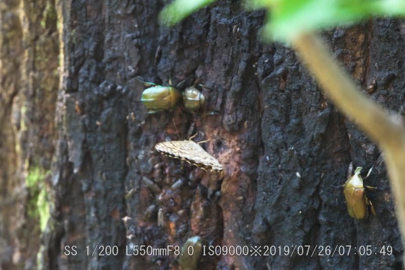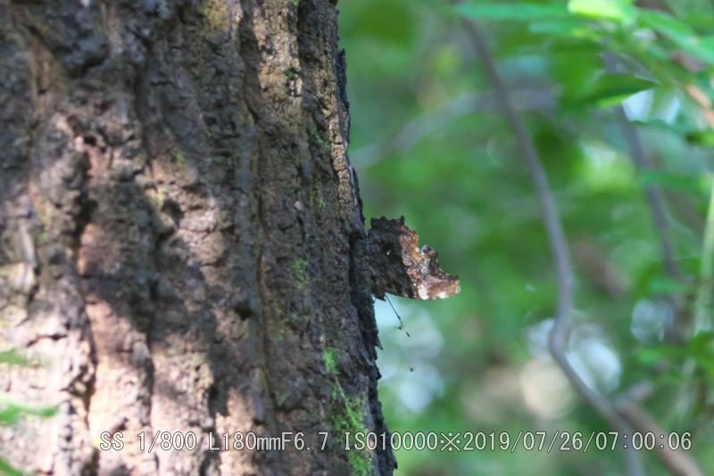 気になる樹だ。いつもより少し遅い、それに久しぶりの日差しだ。予想通りに蜜に虫が集まっていた。蝶もいた。蛾のような色だが、明るい、羽根を閉じて留まる、触角の先端が太いので蝶に間違いない。