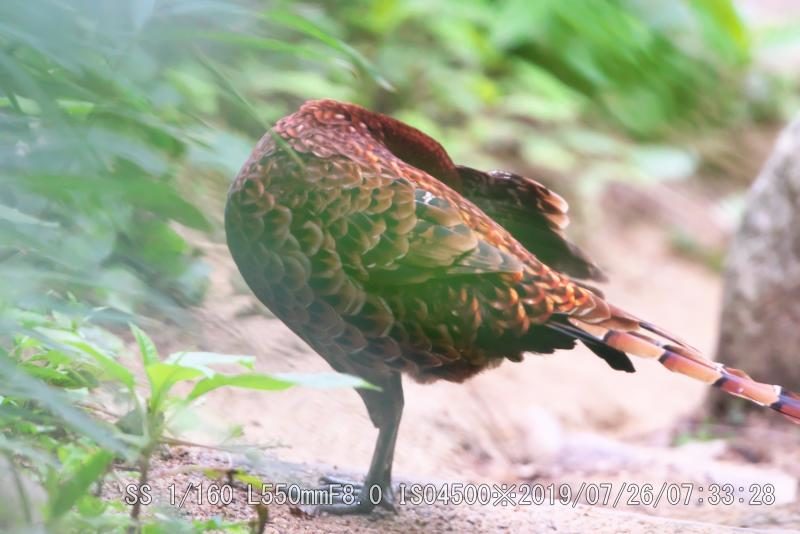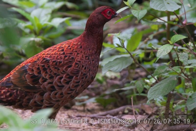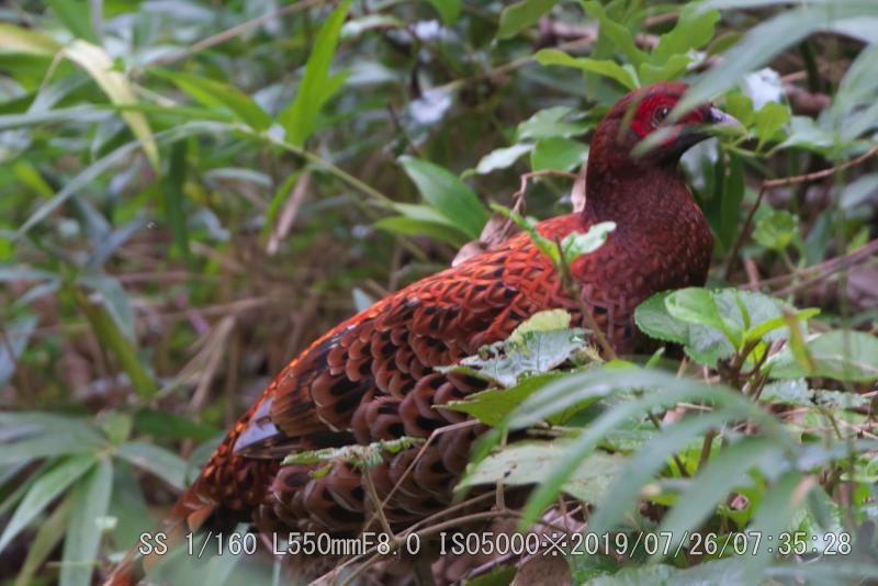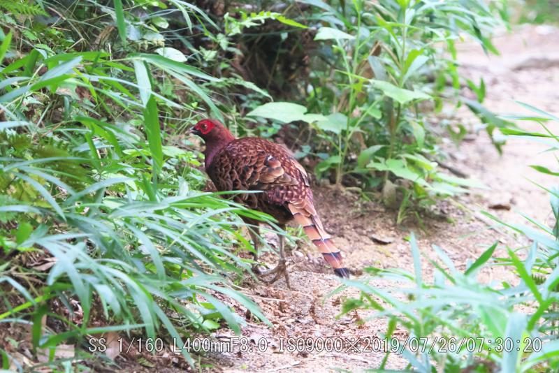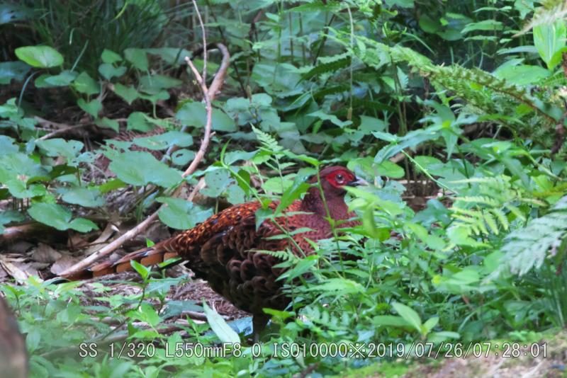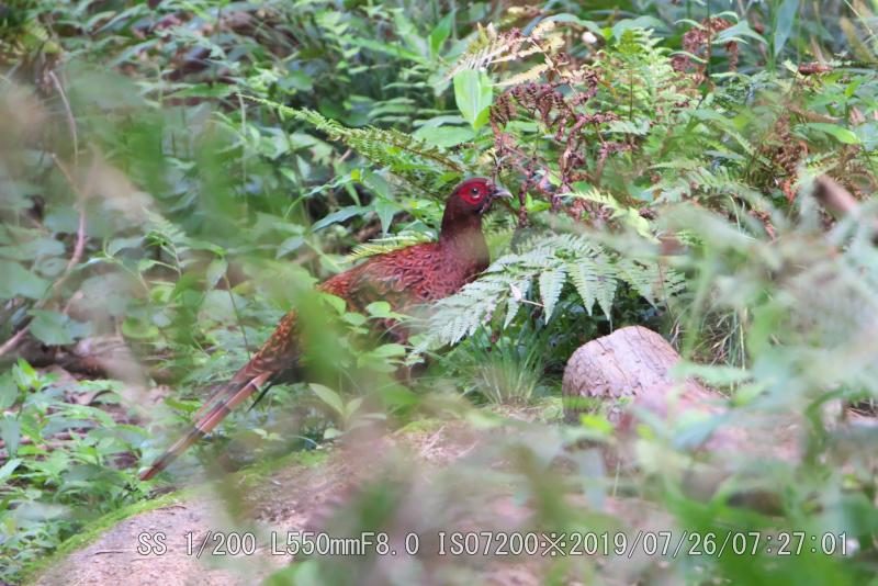 辻の新池堤防の草刈りをしたので、いつもと逆回りコースになった。カメラをスタンバイして登山道を下った。100メータぐらい先で無防備に餌をついばんでいた。途中で気付かれたが逃げ出すことは無かった。道沿いに一緒に降りたが、途中で尾根の草むらへ姿をけした。※7月は3回目だが6月は1回だけ見た。