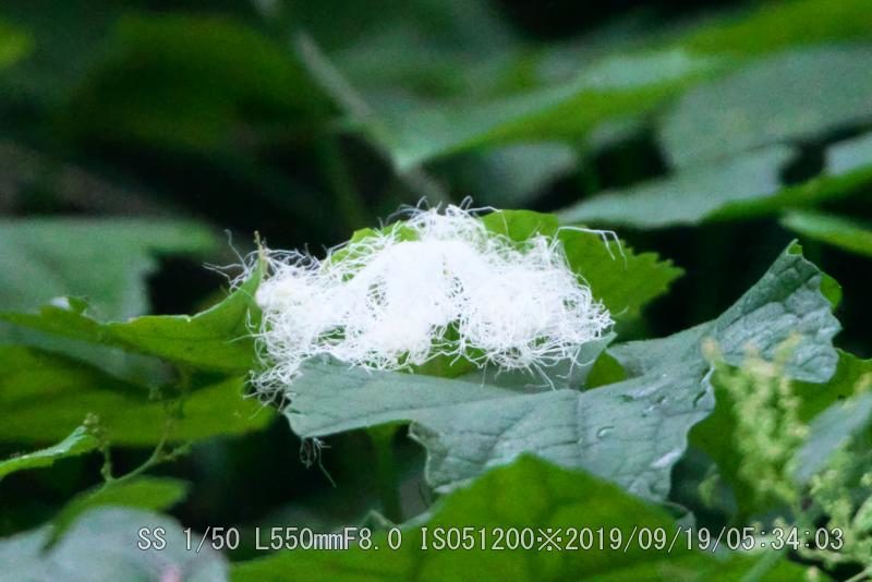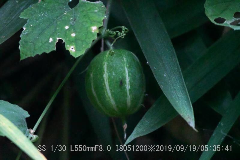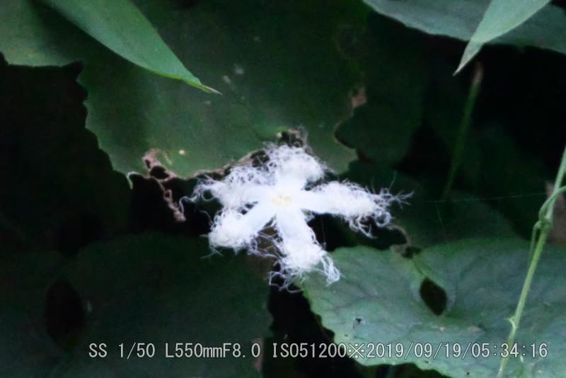 いつもより朝が早かったのでカラスウリの花を写してみた。萎む前のが撮れた。2019/08/22の夜に撮った花の実は随分と大きくなった。