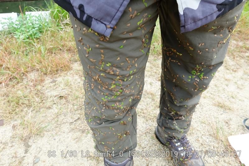 堤防の一番奥まで草刈りをした。草の丈が高くて身体全体(帽子~靴)にヌスビトハギのお土産を頂いた。