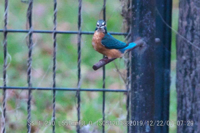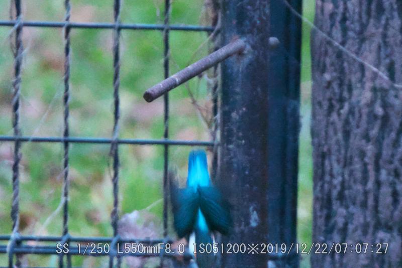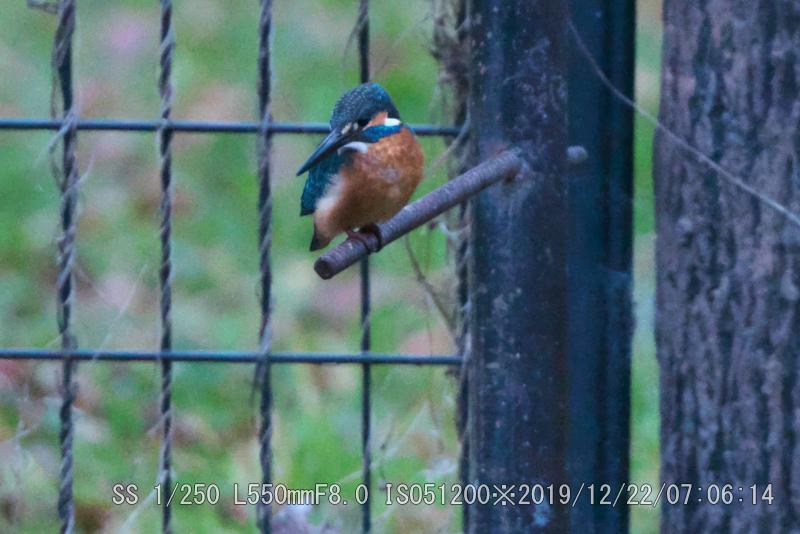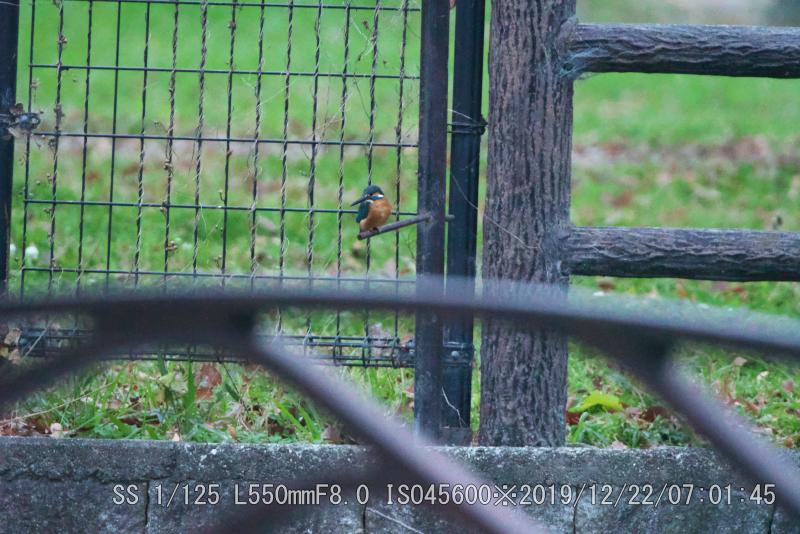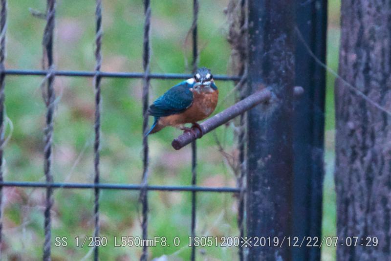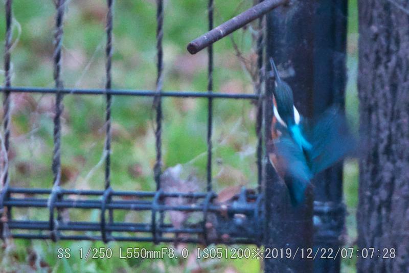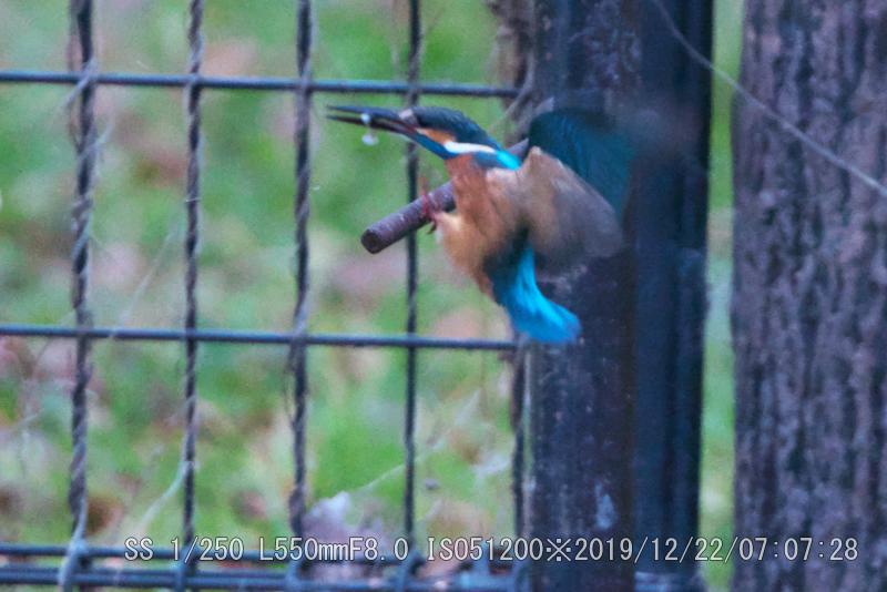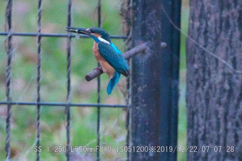 撮影できる明るさ(7時頃夜明け)を池の端から橋(端)を往復して15分ほど待った。水門のフェンスに居た。都合よく止まり木の鉄筋があった。顔のアップ画像で飛び込みの意気込みが伺えた。頭を傾けたりして目線を変えて突然ダイビングした。カメラアングルを変えること無く待った。12コマ(約1秒)後に小魚ゲットで戻った。やはり あの尻尾を上げたポーズがある。興味深いのは餌をすぐに呑みこまない。3秒ほど間がある。
