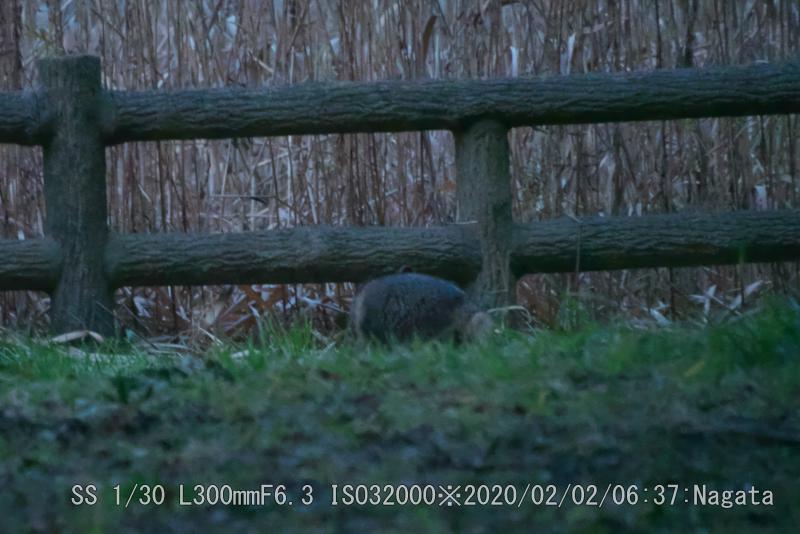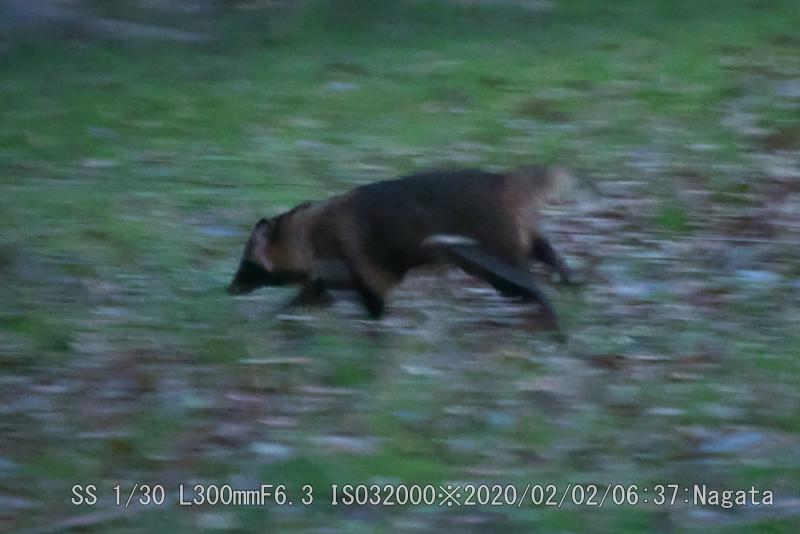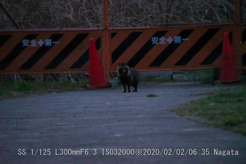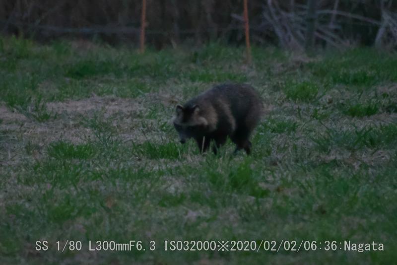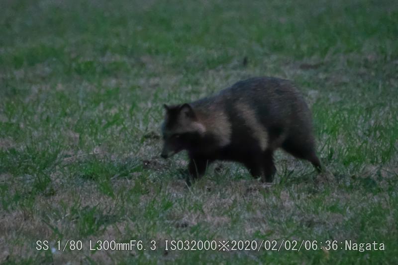 タヌキ 薄明薄暮の早朝、猫の多い公園なので、てっきり猫かと思った。でも少し大きくて動きが変だ。カメラを向けて分かった。タヌキだった。200メータぐらいの草原(くさはら)を横切ろうとしたが元居た場所へ戻った。湿地で身を隠すような雑木林も無いので、結局は山へ帰るだろう。 カワセミ 十月桜 梅