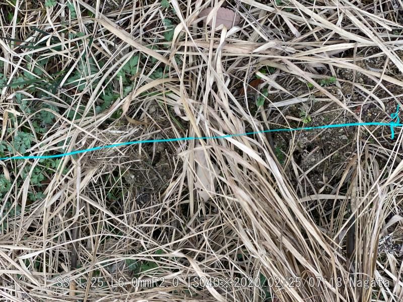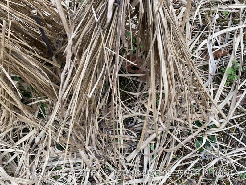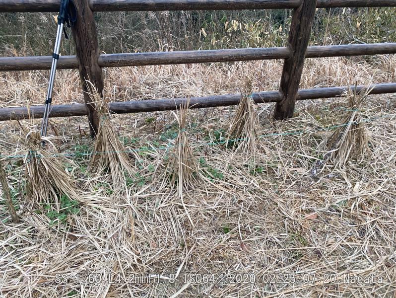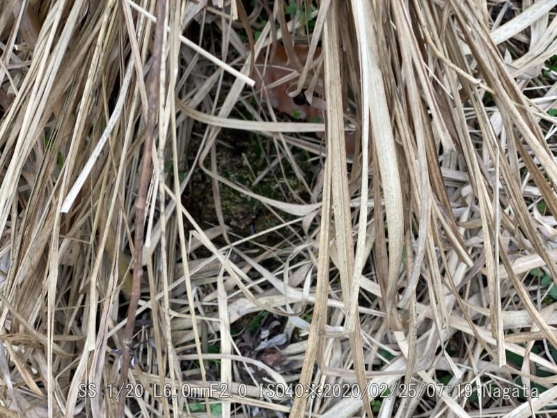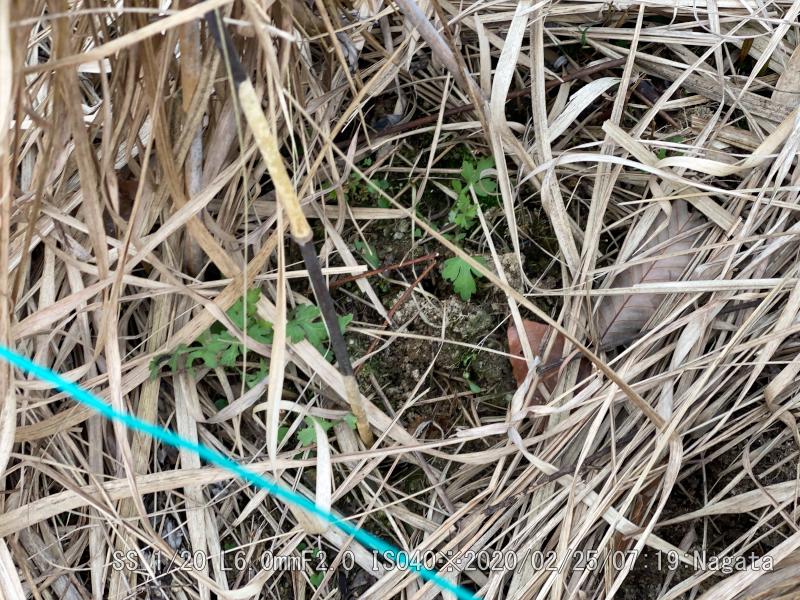 奥側の5本を丁寧に枯れ草テントの隙間を開けて、10センチぐらいに育ったユリを抜き取っている。球根は残っているから、嫌がらせだろう。手前側の5本は手を付けず無事だった。