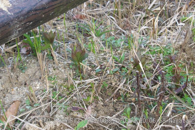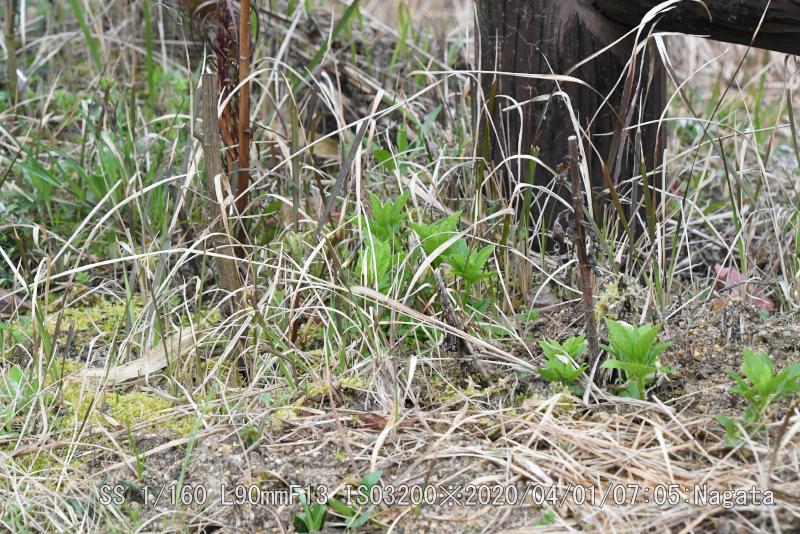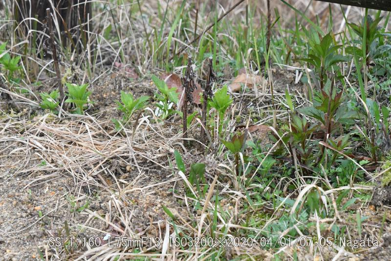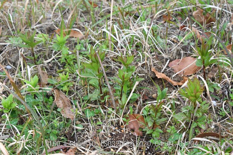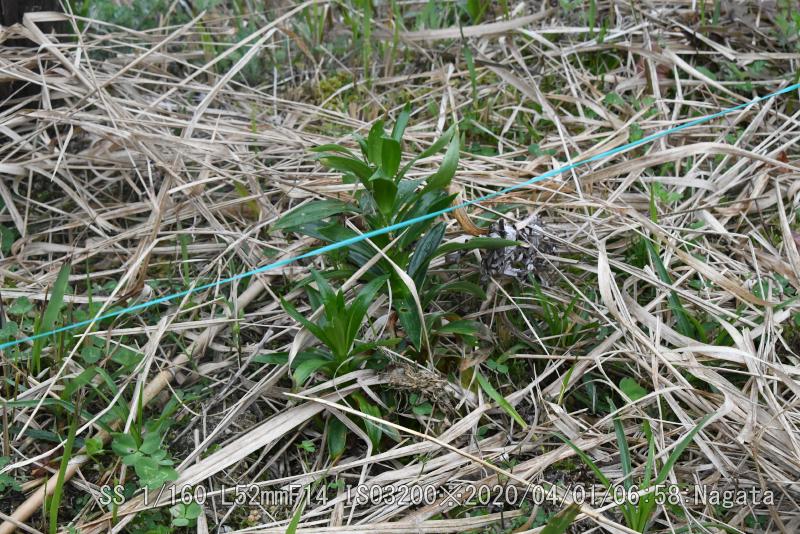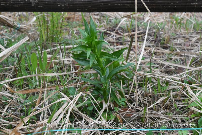 辻の新池の堤防のユリの覆いをとった。覆いが無かったユリは傷んで育ちも悪い。球根を植えた数50個の10本が2年目の成果だ。ヒヨドリバナ、フジバカマの種からの新芽も10センチぐらいまで育った。