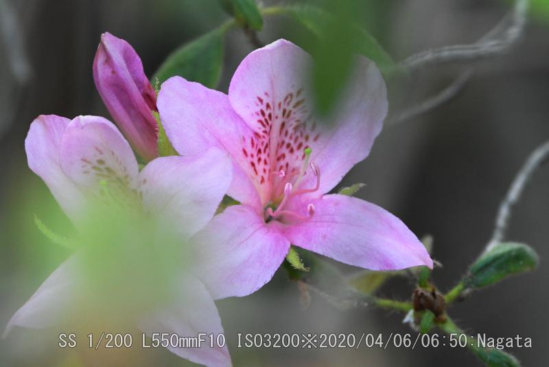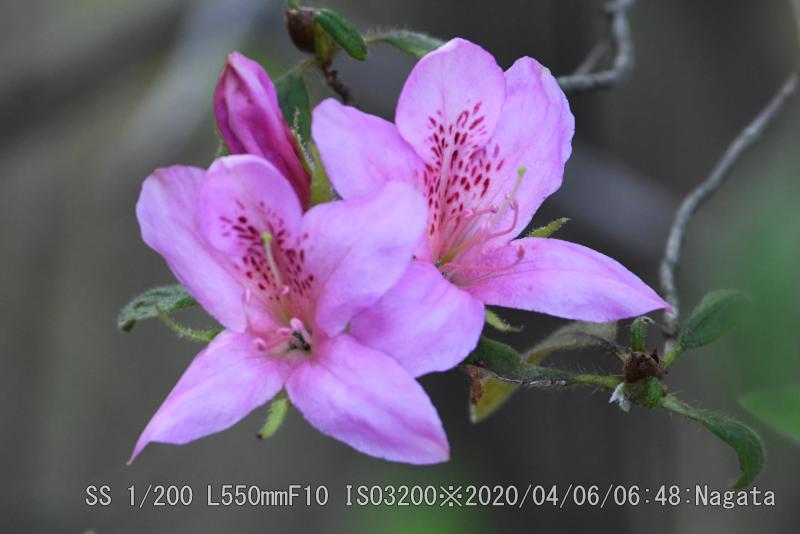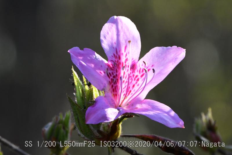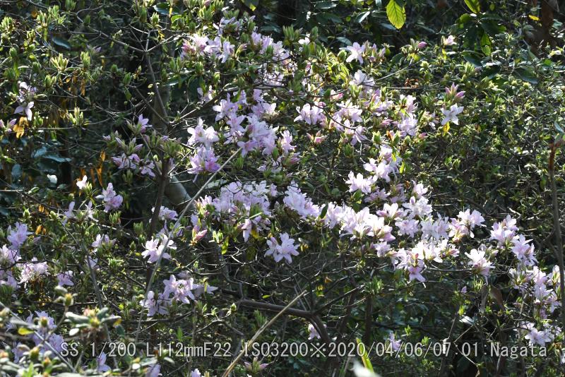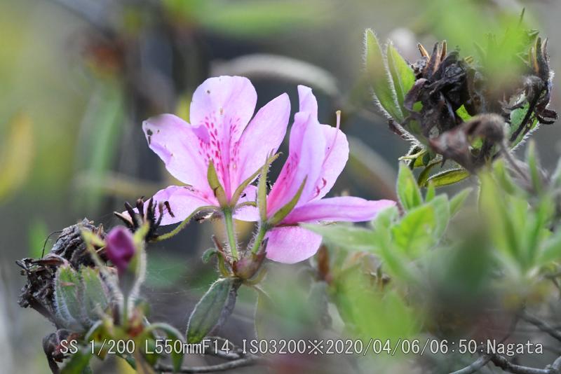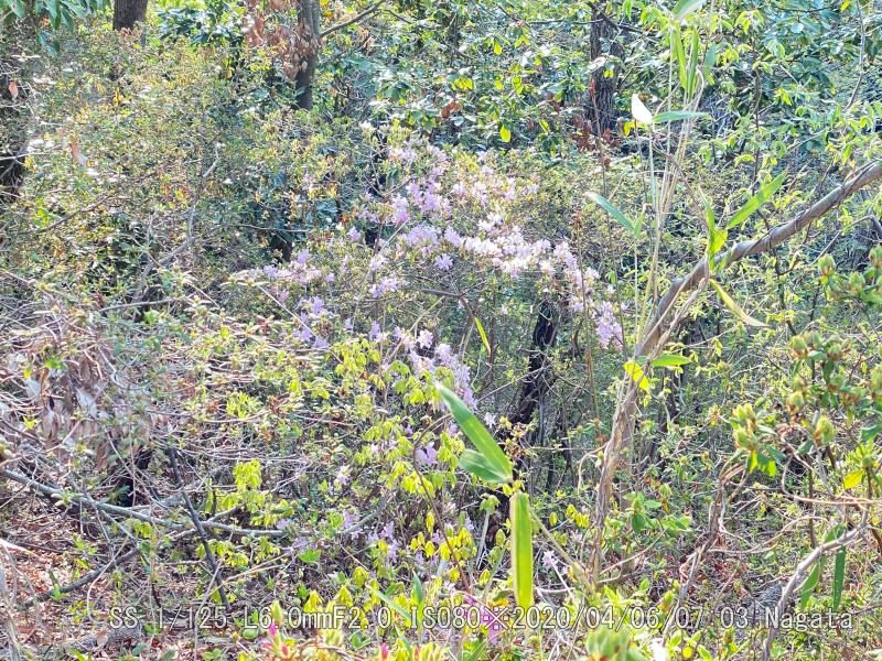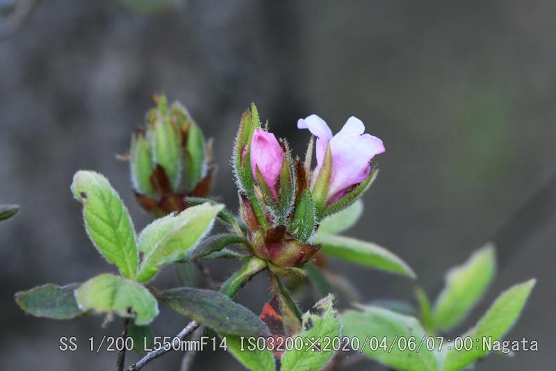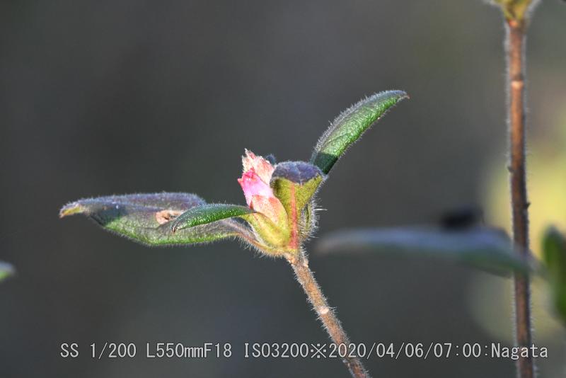 辻の新池から頂上へ向かう尾根が七曲りから来る道と合流分岐までを、つつじ尾根と呼んでいるようだ。ツツジが散在している。樹によって花の付き方に差がある。数個程度付いている樹から多数付けて満開?に近い樹まで有る。花をよく見ると花びらが5枚あるように見えるが、根元がくっついている釣鐘型になっている。