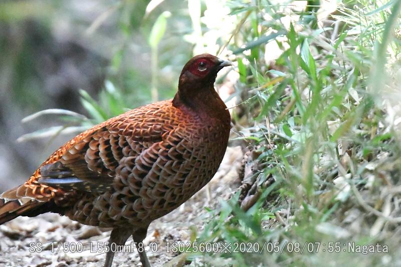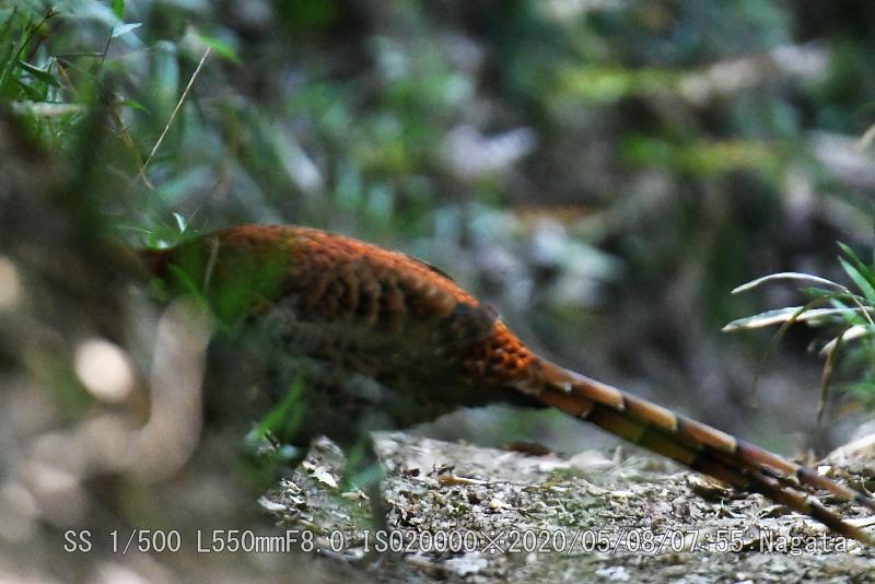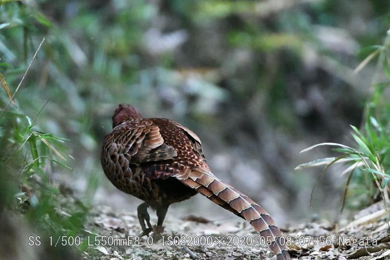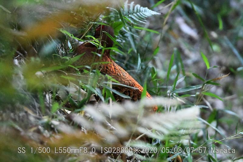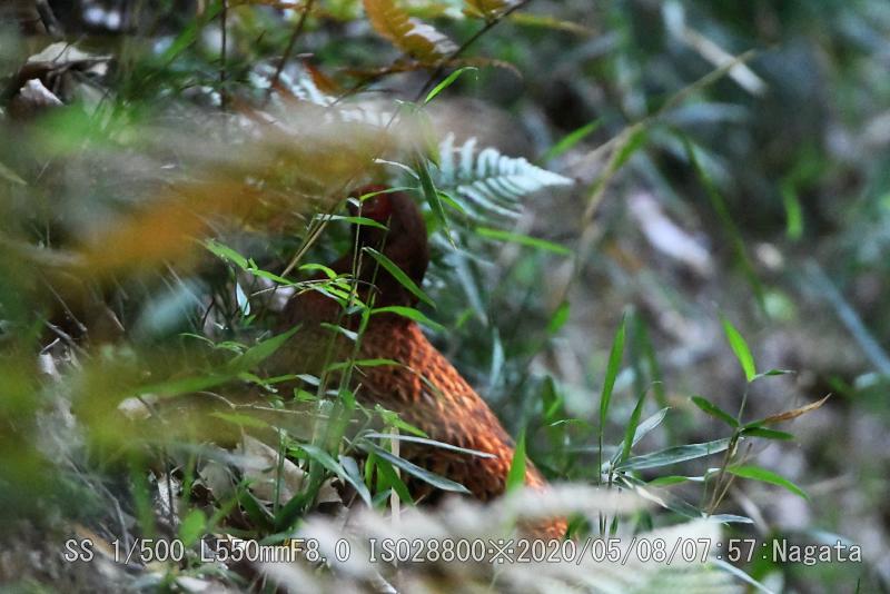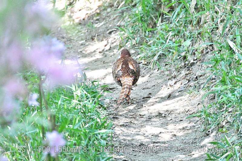 竪堀(たてぼり)の下り坂を50メータぐらい先に居た。途中気付かれたが、気にせず道草を食いながらゆっくりと降りて行った。後ろから撮ると、あの黄金の輝きがまるで無い。ピントも合わせ辛い。