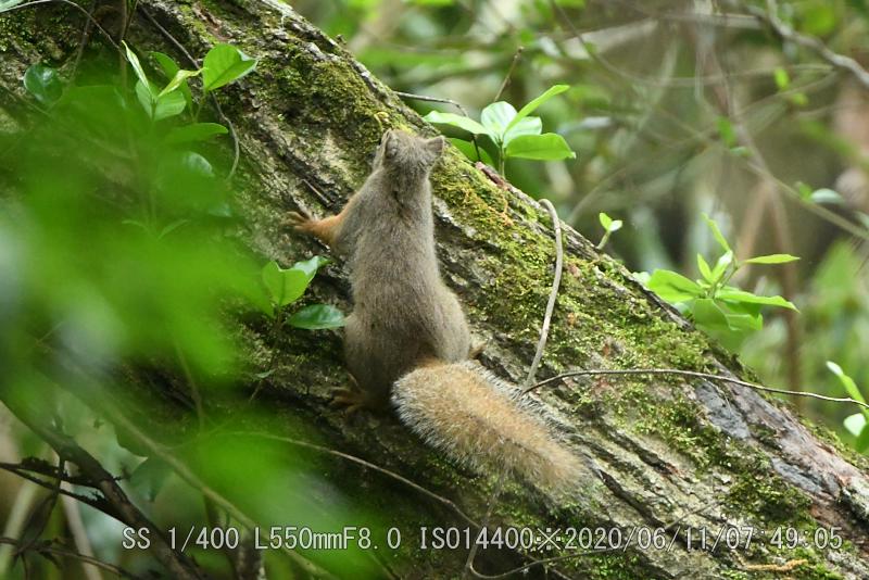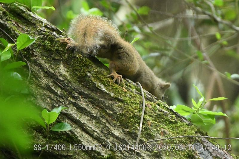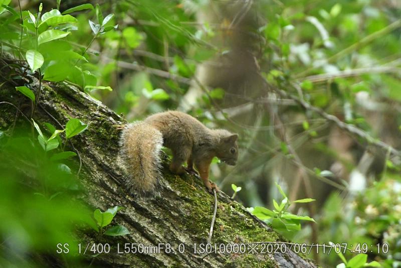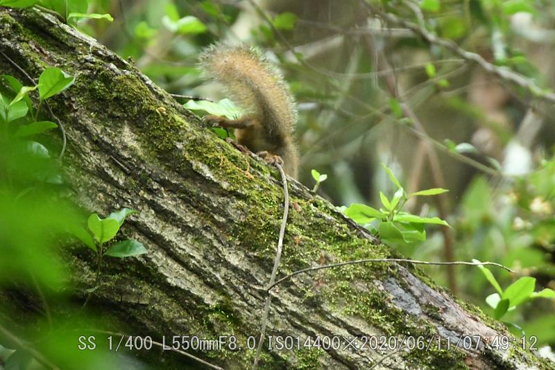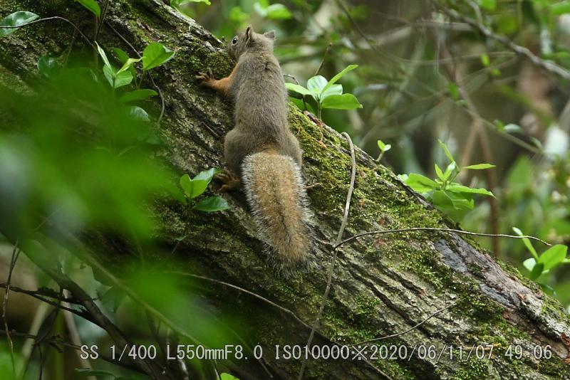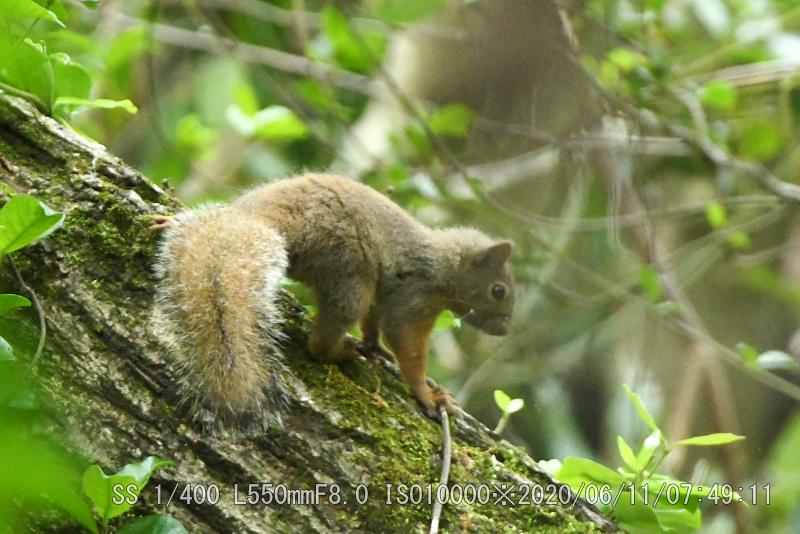 この場所では2度目だ(撮影は初回)ヤブサメを撮った10分後で、カメラを肩に掛けてスタンバイ中だった。リスは慌ただしく7秒の滞在だったが、カメラの真正面だったのでリスに気付くのも早かった。