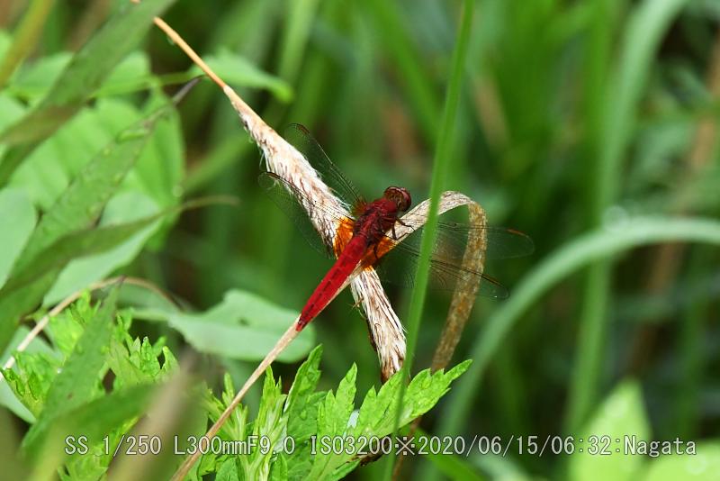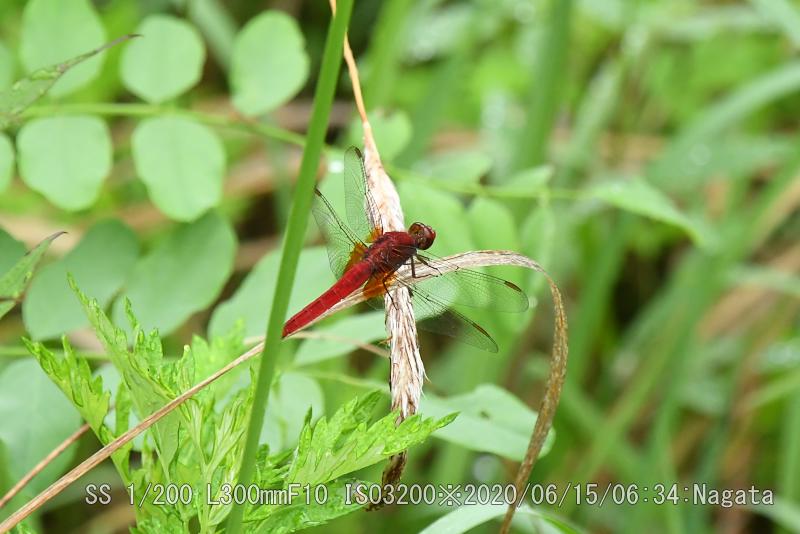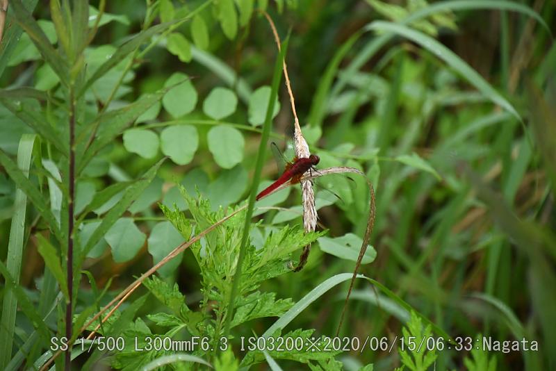 辻の新池堤防法面に朝露に濡れていた。翅がが透明だ。下へ下がった形で止まっているので赤トンボに間違い無いだろう。今の時期珍しいが前回桜池で見た時と同じ頃だ。は『アカトンボ属』のトンボの総称”で、代表的なトンボが『アキアカネ』。他にも『ナツアカネ』や『コノシメトンボ』
