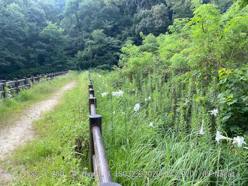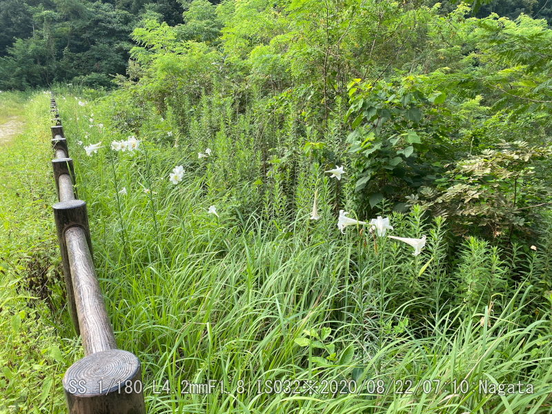 辻の新池堤防のタカサゴユリが咲き揃った。柵の外側が多い。種を意識して撒いた結果だろう。