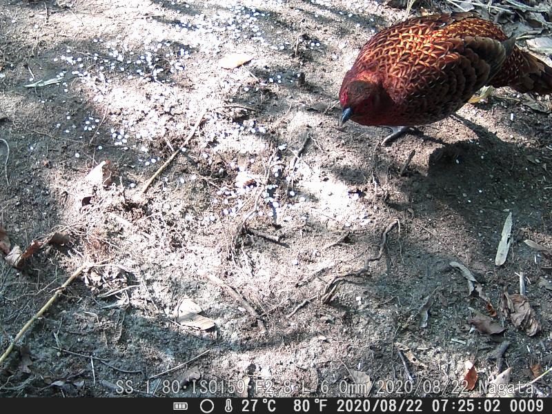 5日ぶりだ。なぜか元気が無さそう。2コマのみ写ってた。ちいさなトカゲが写るのにヤマドリのその後が写らない。猪も画面からはみ出る。24日にカメラを撤去した。