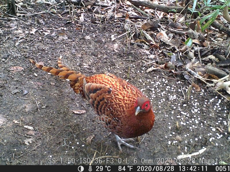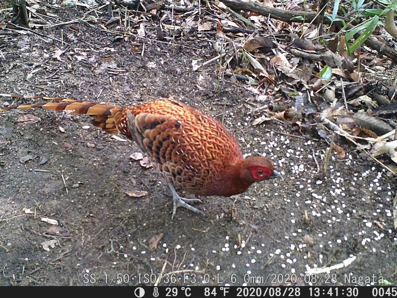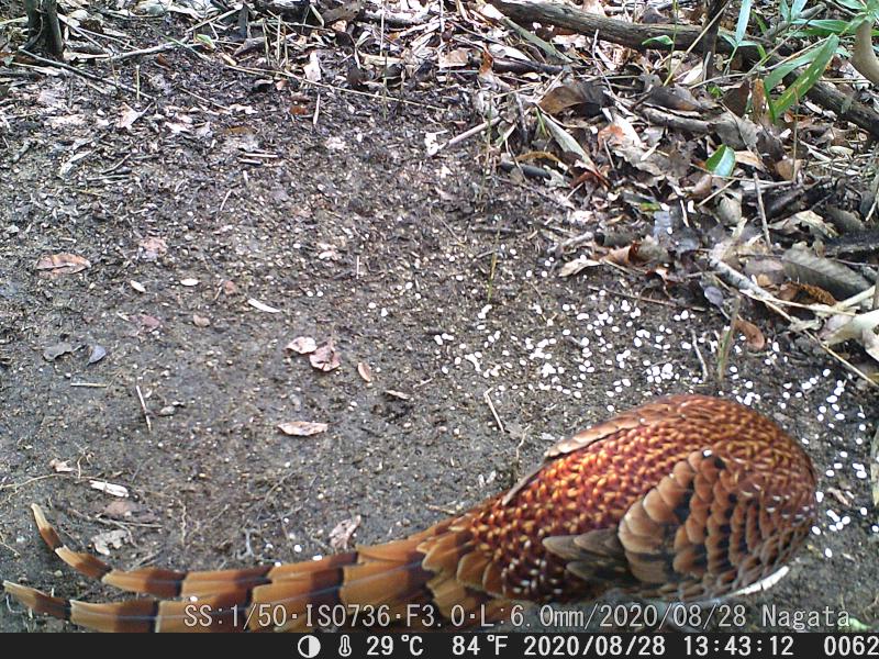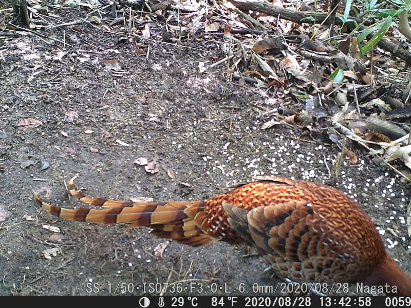 広角レンズで無い(L=6.0)なのでカメラ位置を20センチほど上げた。それに、麦の撒く位置を遠ざけた。ヤマドリは尻尾の羽根を入れると1メータ超える。何とか納まった。最近のヤマドリの尻尾が7月頃に比べると長くなった。