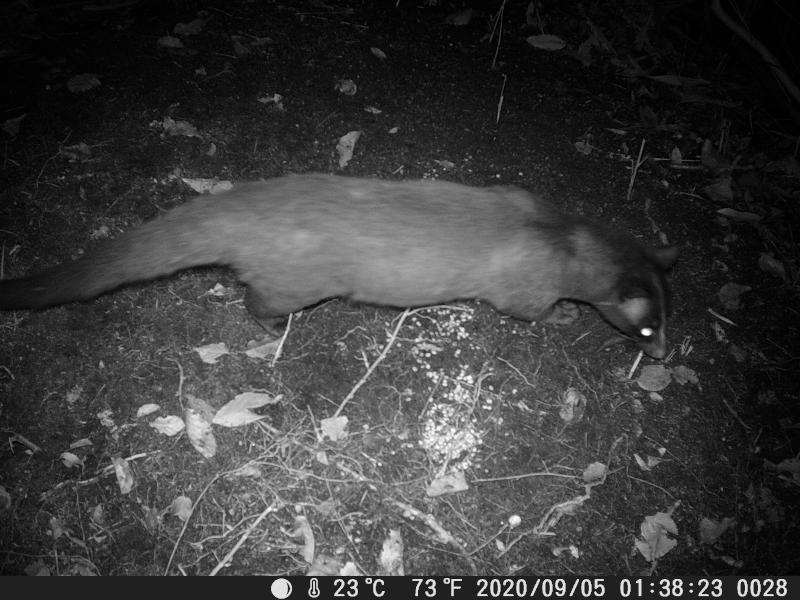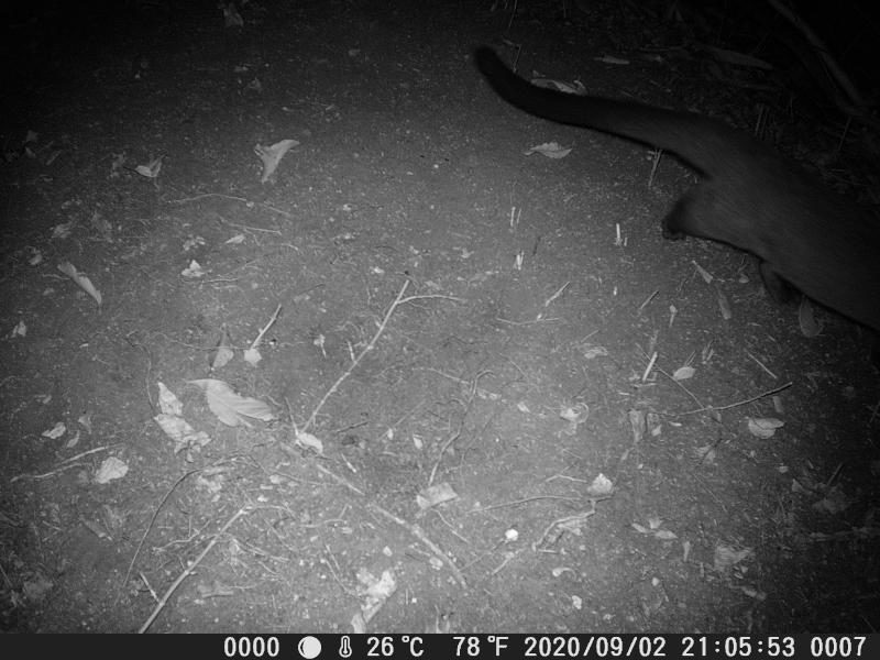 食肉目ジャコウネコ科ハクビシン属。日本に生息する唯一のジャコウネコ科の哺乳類で、外来種。カメラ初出演だ。大きさがヤマドリくらいありそう。1メータは超えそうだ。9/2にもカメラを横切っている。