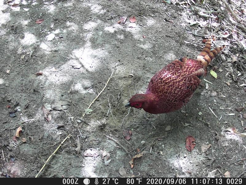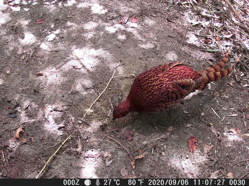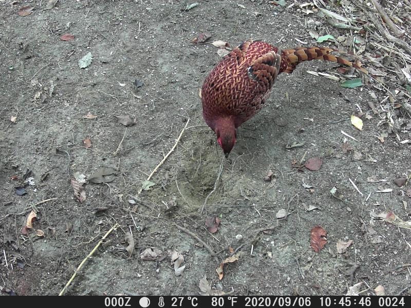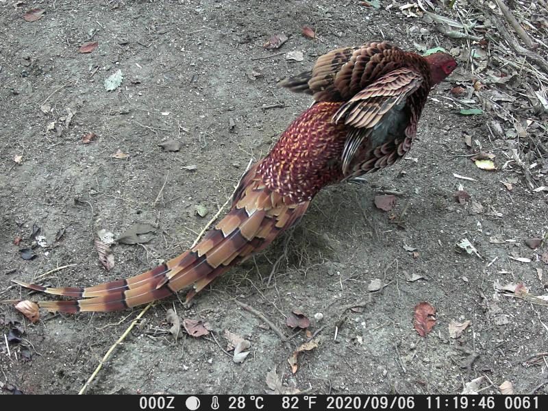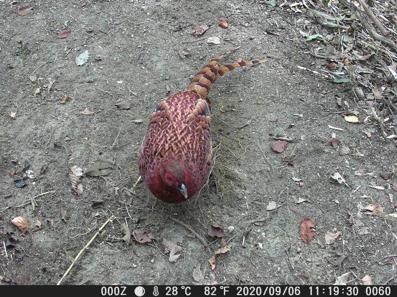 トレイルカメラが、やっと馴染みだした。対象物との距離が改良した。ヤマドリが全体に写る。餌が無くなったサイクルで来ている。それでも35分ほど滞在している。尻尾が長くなった。