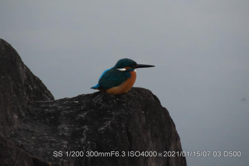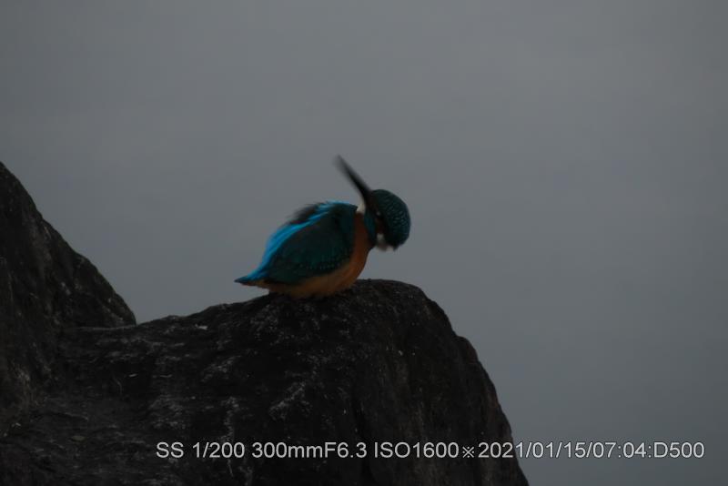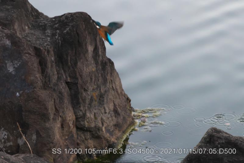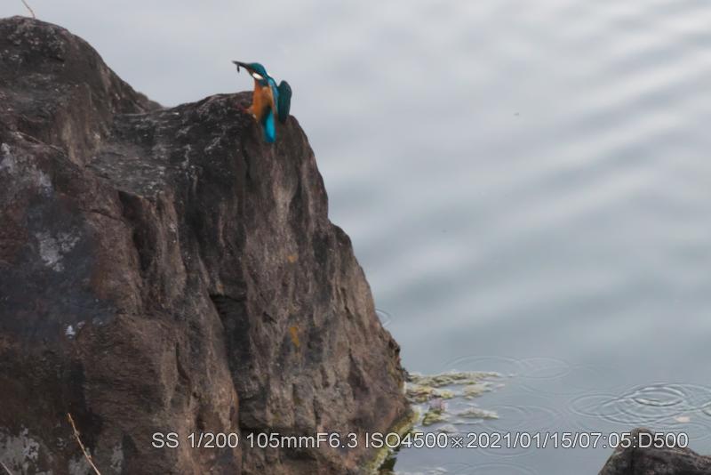 山へ帰ったと思ったが池を一回りした。飛んで行くのを見たので、いつもの岩へ戻ってみたら居た。飛び込む気配満々だった。暗いのでやはりシャッタースピードが上げられなく、残念な結果だ。頭をひっくり返すぐらいして飛び込みの位置を測定したようだ。目が側面について居るので片目で見る。その直後飛び込んだ。シャッター全然間に合わず。