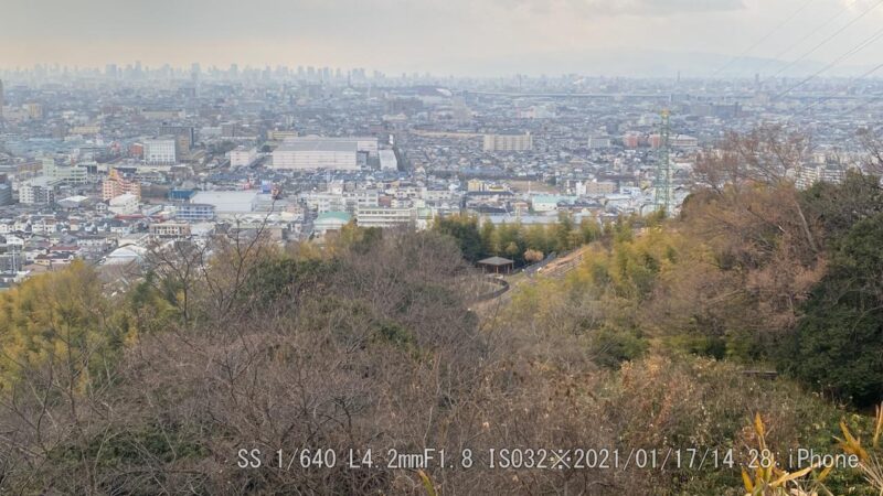 堂山古墳郡から大阪市内方面。あべのハルカスが霞んで見えた。