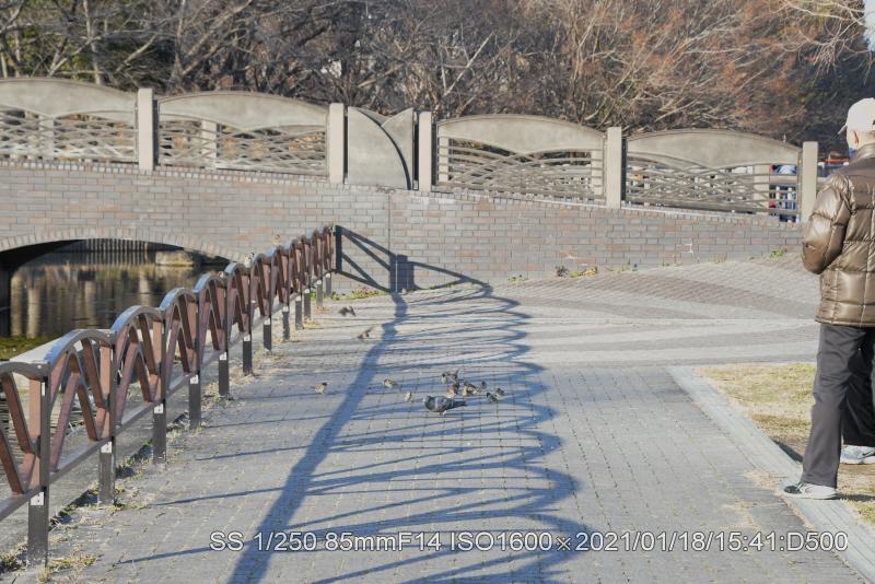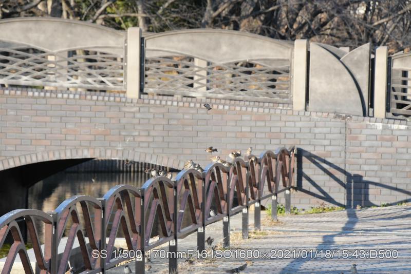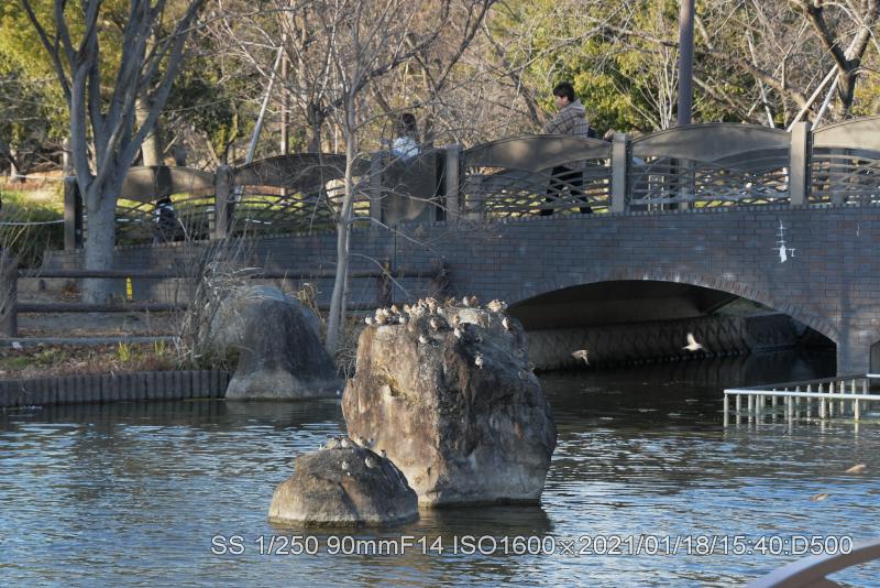 いつもは水鳥が留まっている岩にスズメが群れていた。スズメのオジさんが餌を撒いていた。