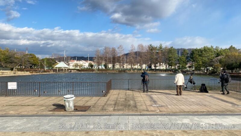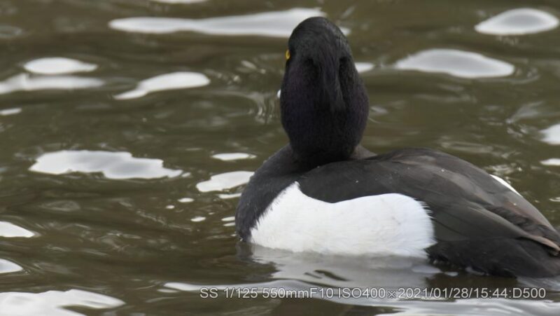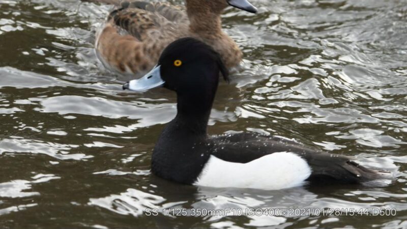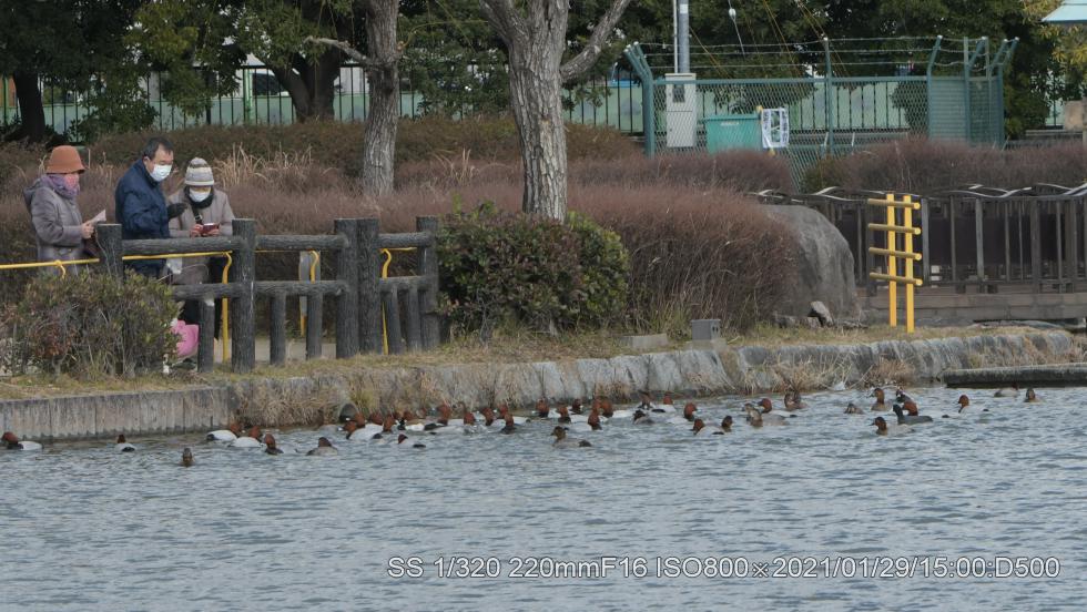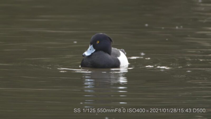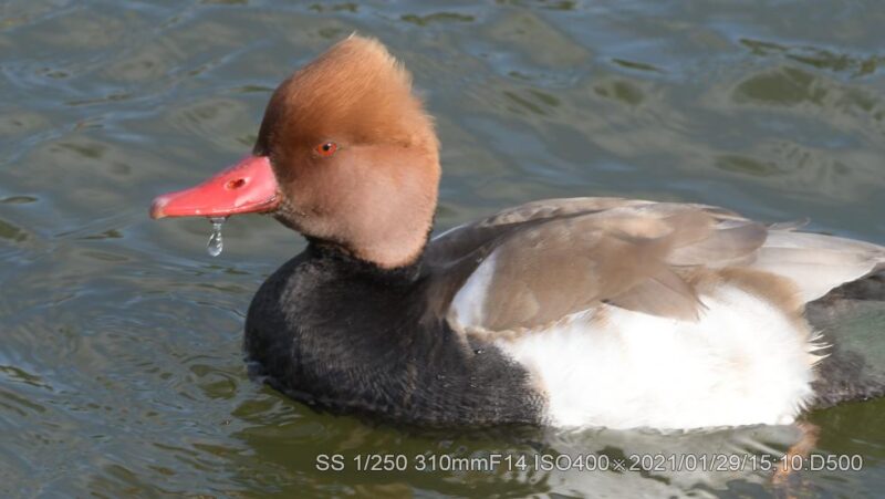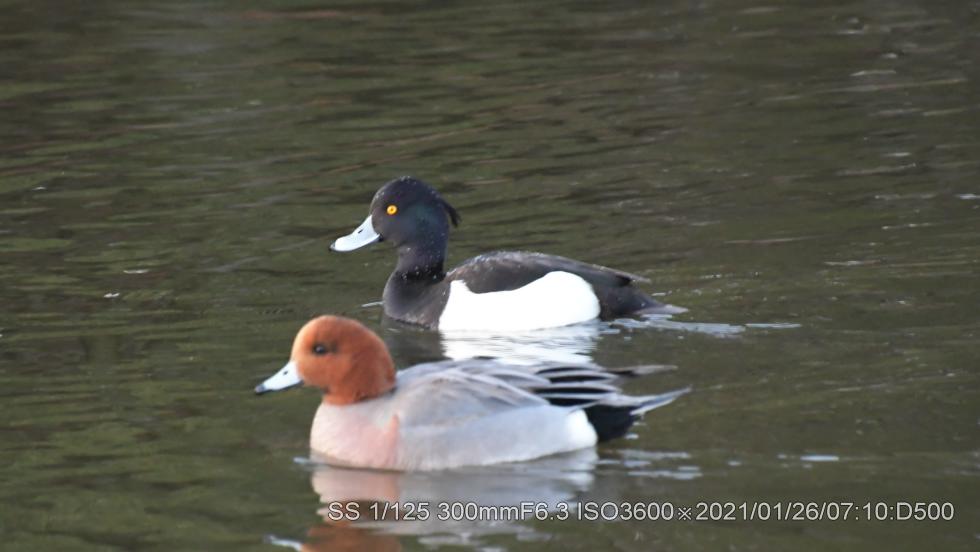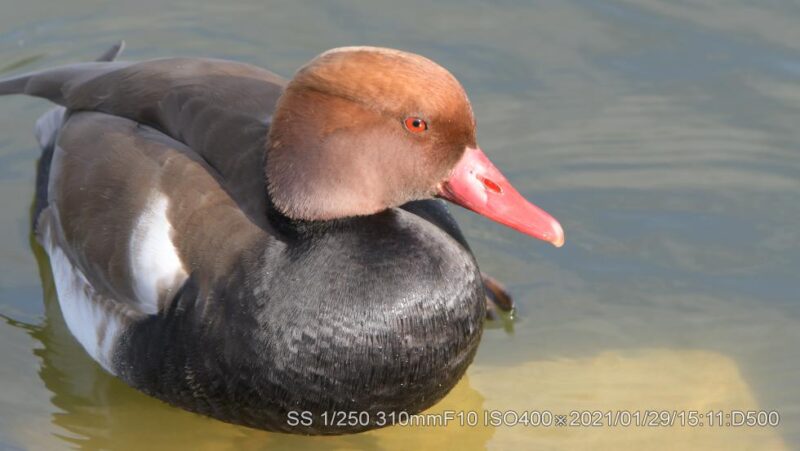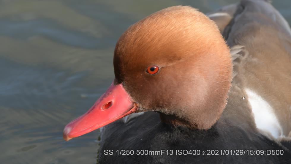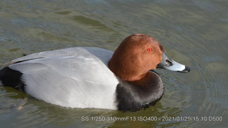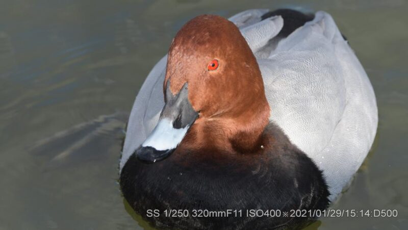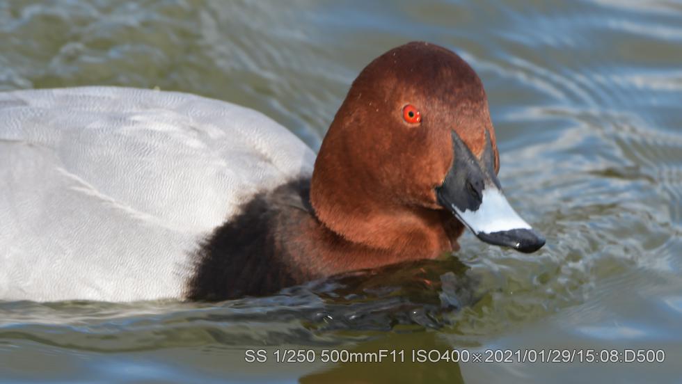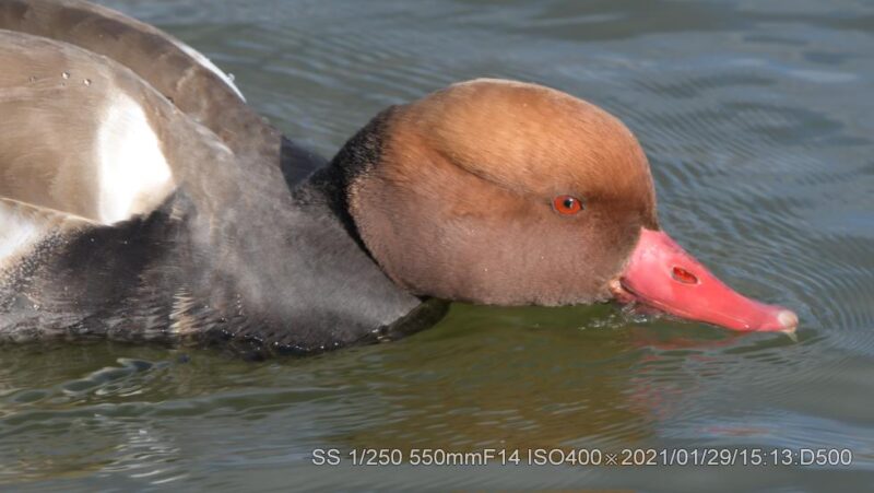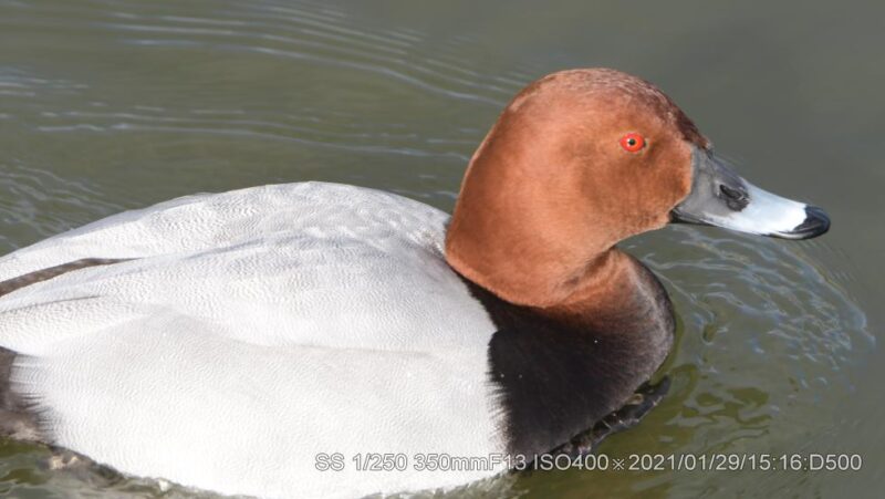 門真市・弁天池 アカハシハジロ(一羽だけ)・嘴が赤い、目も赤い、羽は白。ホシハジロ・目は赤色、羽が白(スズガモに似ている)。昨日は目にピントが合って無かったのでリベンジ。400ミリズーム×1.4コンバータは威力がある。それに鴨が人慣れして近づいてくれた。 深北緑地・キンクロハジロ