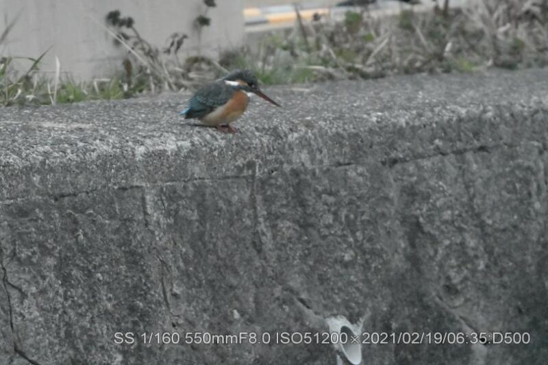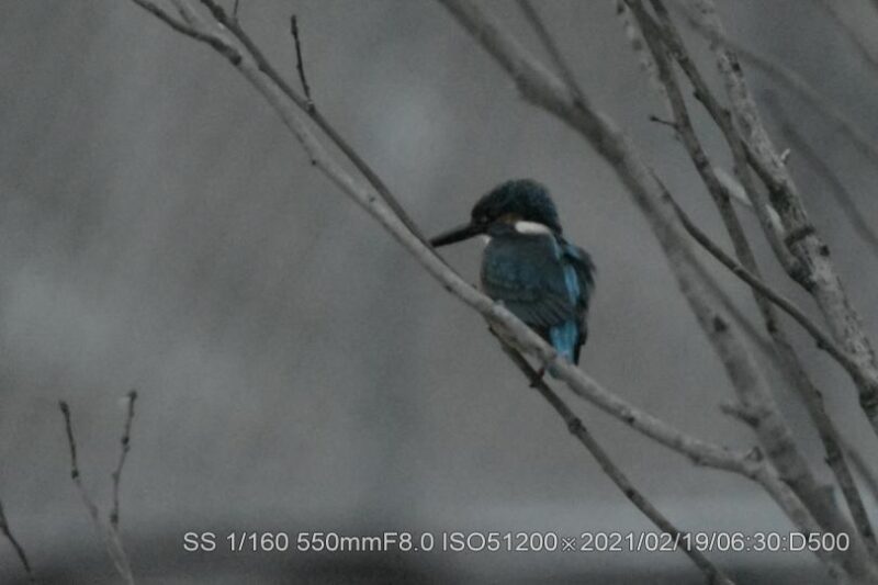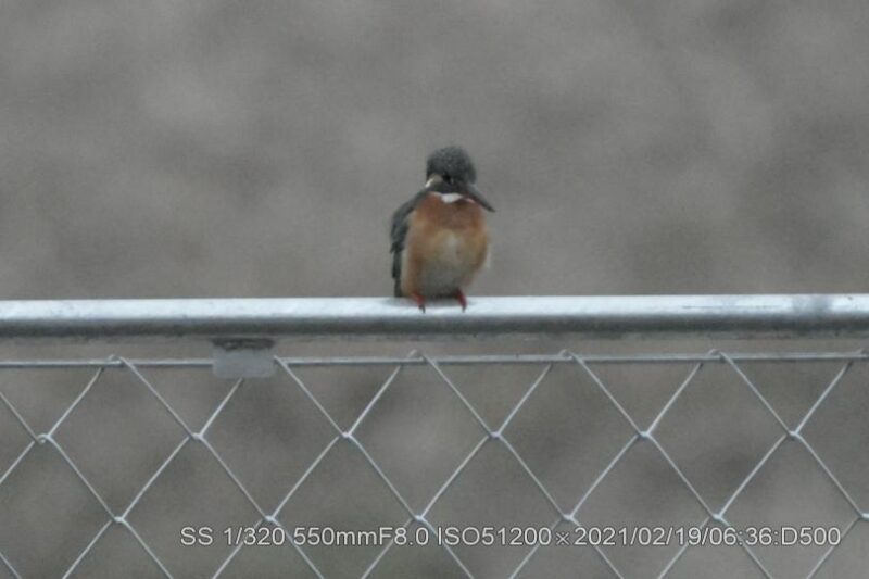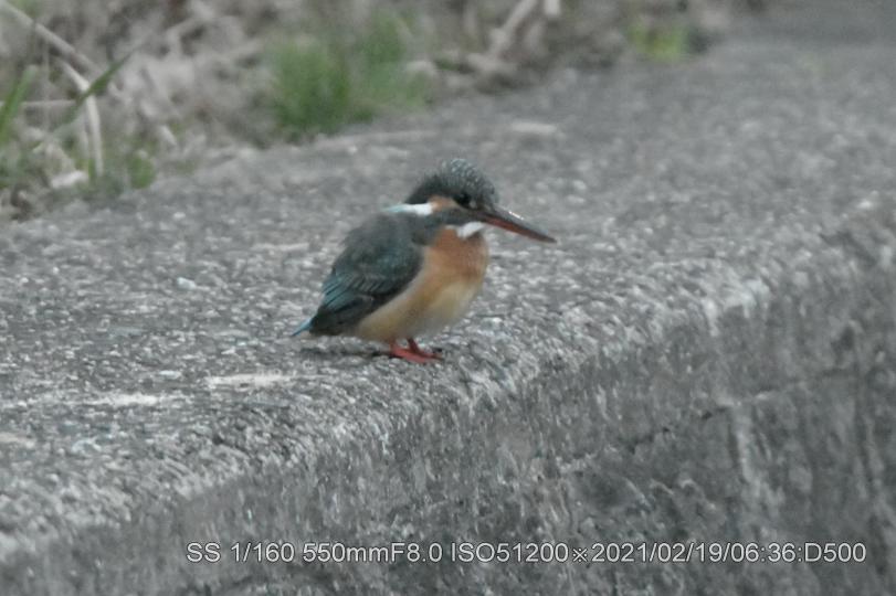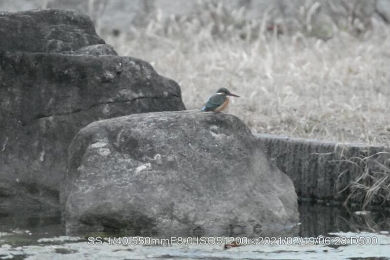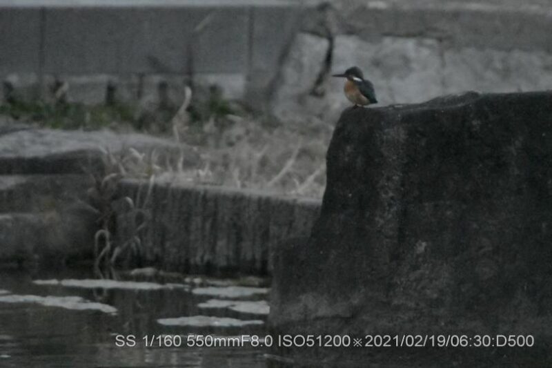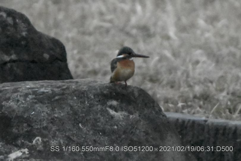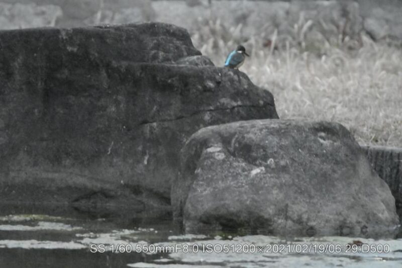 深北緑地。早く来すぎて辺りは薄暗く、生憎の曇天だ。50メータほど離れた近くの広場でラジオ体操は未だ始まってなかった。ISO上限51,200露出補正+4段に設定。ピントが合うシャターの切れる明るさを待った。20メータぐらい離れて2羽居た。石の上にオス、枝に止まっていたのがメスのようだ。暗さの中でかろうじてクチバシの赤さが確認出来た。幼さは残っているが番(つがい)か。