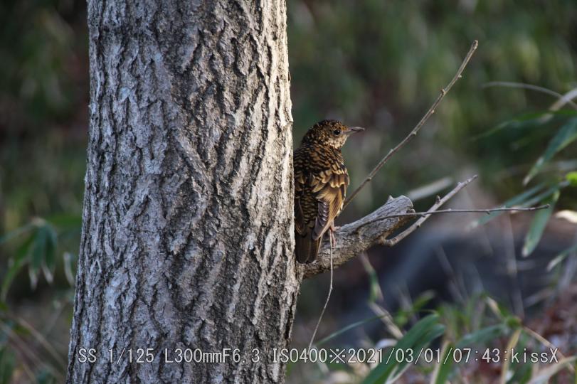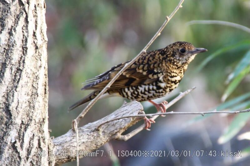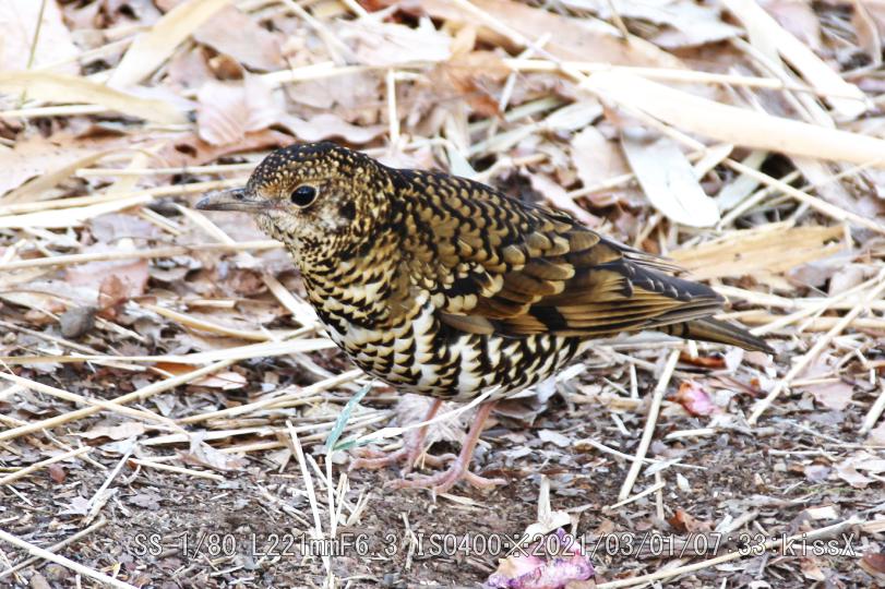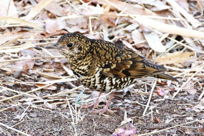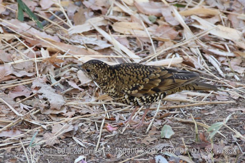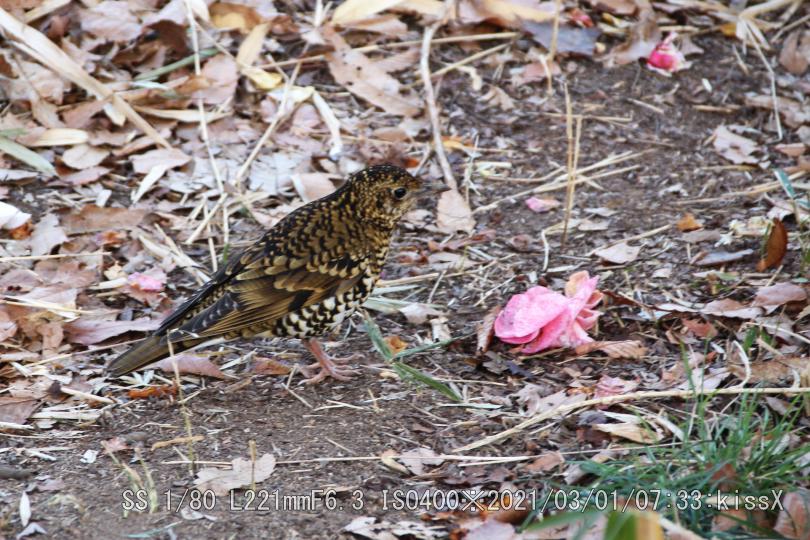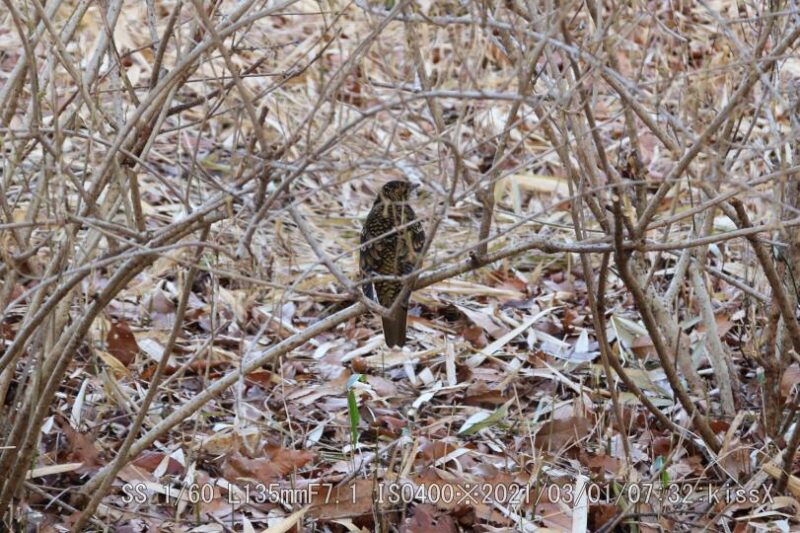 スズメ目ツグミ科トラツグミ/留鳥または漂鳥 FMアンテナ塔近く、五色椿の下で居た。ツグミより一回り大きい。ウィキペディア(Wikipedia)によるとツグミ:全長24cm、トラツグミ:体長30cm。おどおどしたとこが無い。トラツグミは鵺(ぬえ)と呼ばれた。