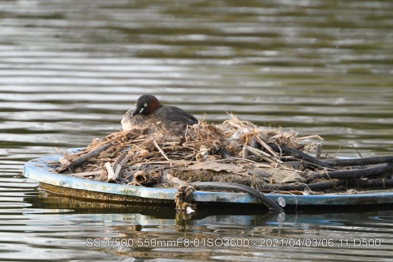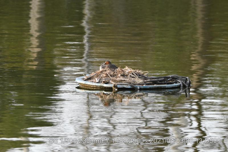 弁天池中央に抱卵中。きょうは400ミリズーム持参。重いので遠距離(7Km)は自転車にした。北側、南側から撮った。北側が近いようだ。雛のような鳴き声が聞こえた。(空耳かな)