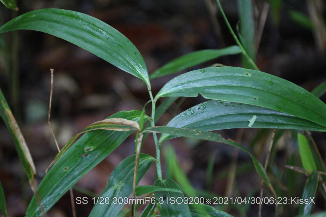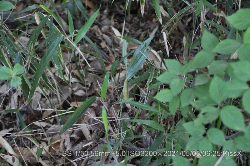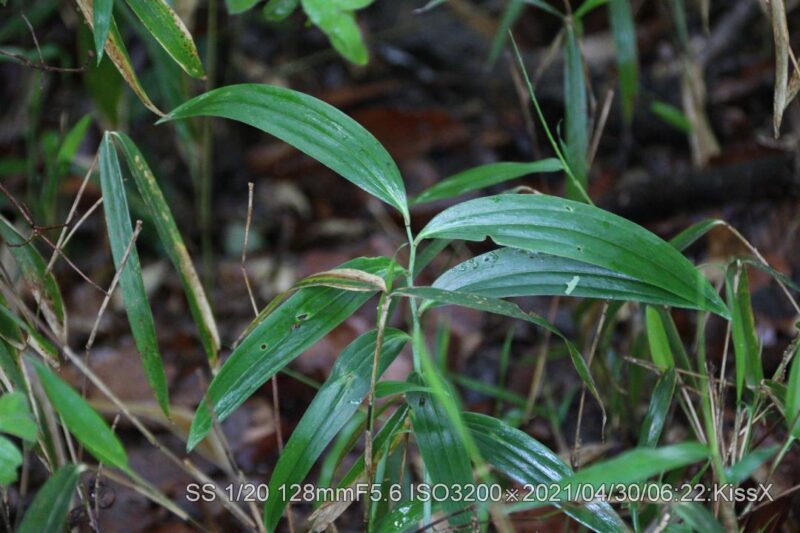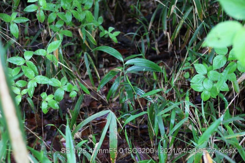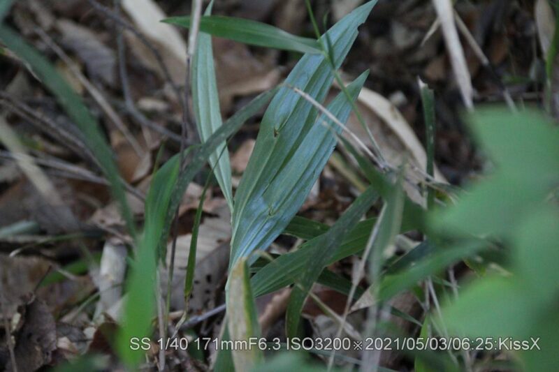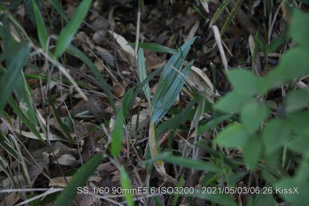 いつもの登山道直ぐ脇。なかなか見つける事ができなかったが、やっと捜せた。道から1メータぐらい脇だ。花が咲くと目立つので、いずれ登山者に見つかるだろう。盗られなければ良いが。 2021/05/03 茎が細いので風で倒れたようだ。