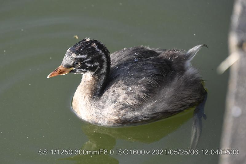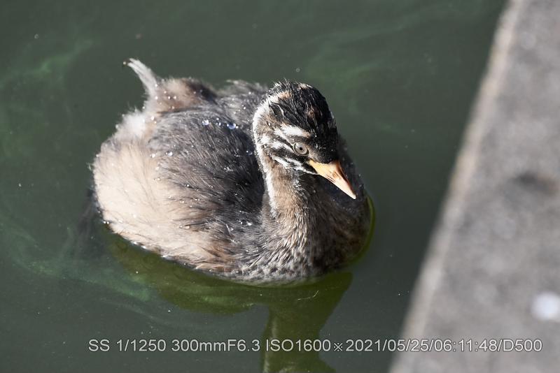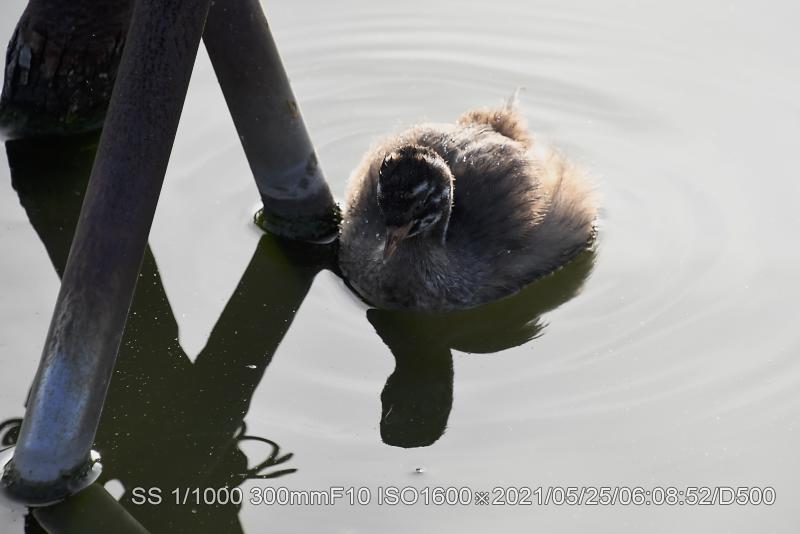 池の中央付近に居たのが近寄って来た。餌付け、人慣れしているが餌も取れるようになった。早々と小魚ゲット。やはり大きめだ。呑み込むのに18秒ほどかかった。大型の鯉に足下をすくわれないうにパイプの横で休む。親鳥と同じぐらいに成長して、早く飛べるようになって欲しい。成鳥の凜々しい顔に近づいた。