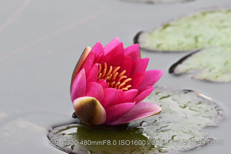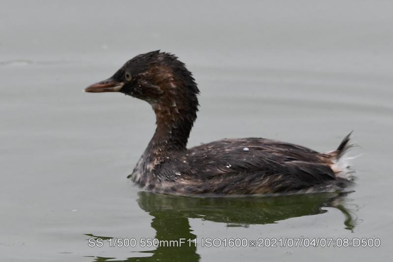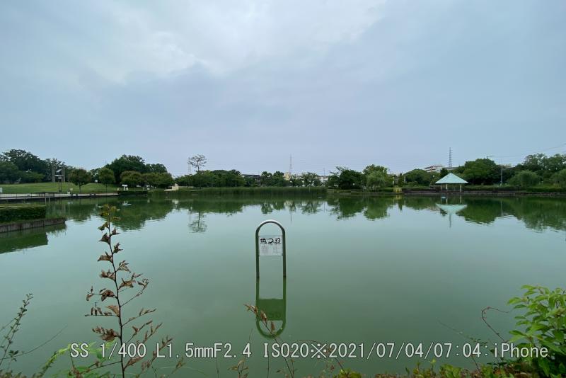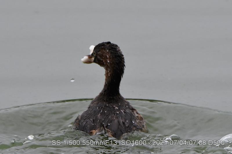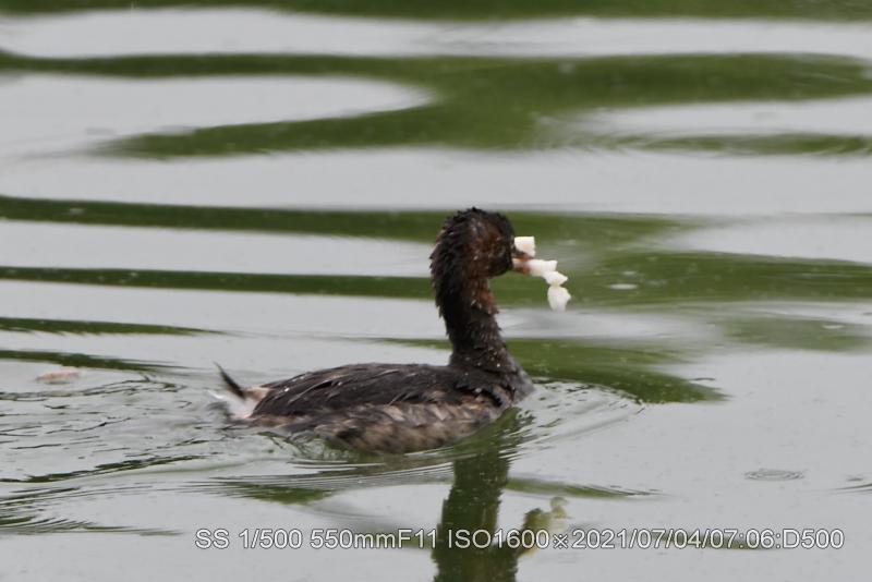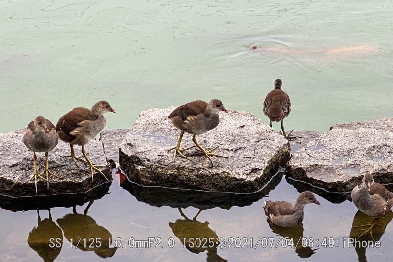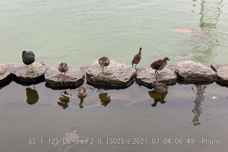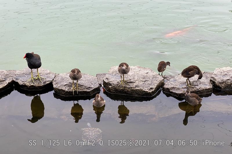 雨模様。バン雛6羽に片親が東屋前に勢揃いした。スマホで写せる範囲だ。成鳥のような顔になった。錦鯉、アカミミミシシッピガメまで写ってた。カイツブリ雛はあまり大きくならない。栄養が足りて無い?かな。スイレンが東屋池に咲いていた。小ぶりだ。