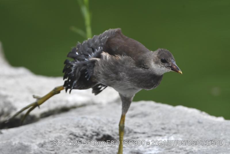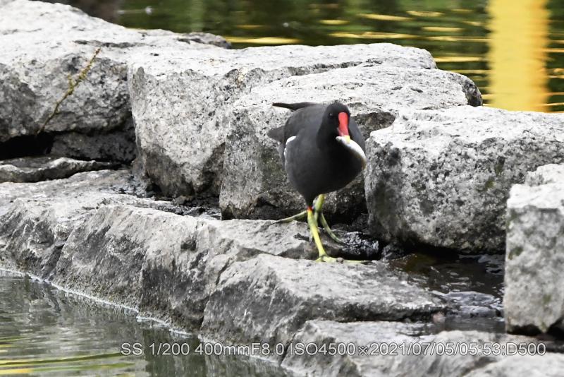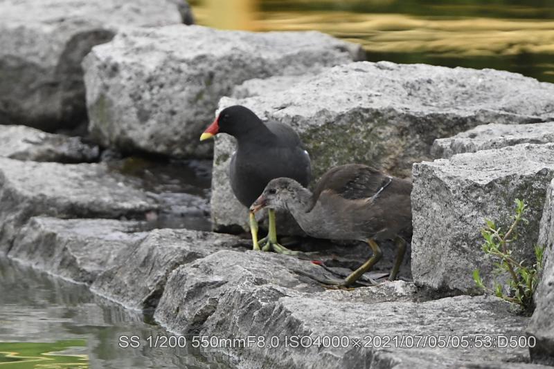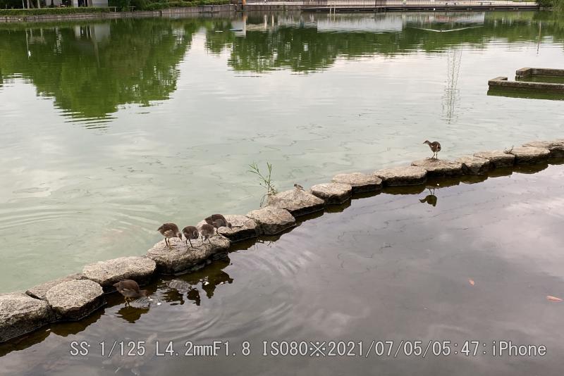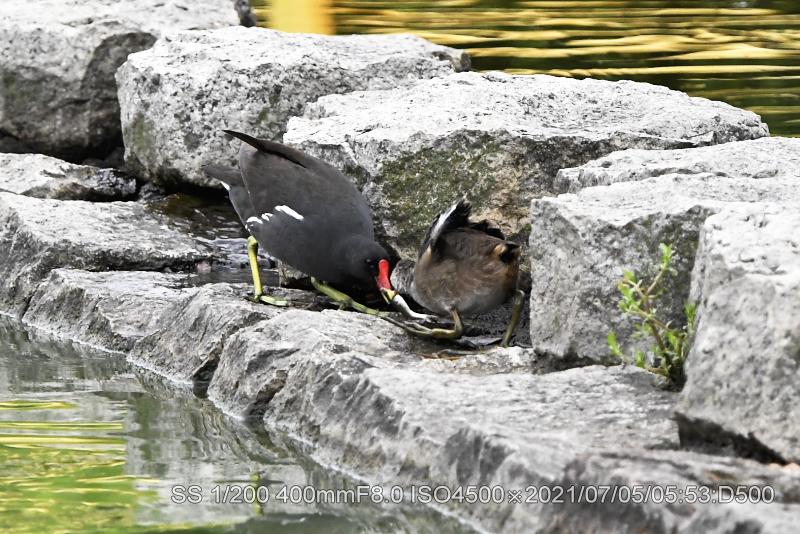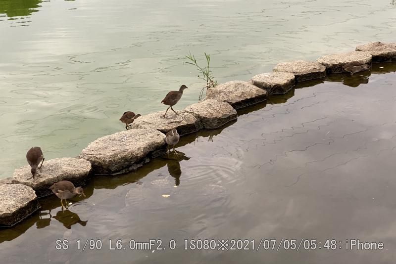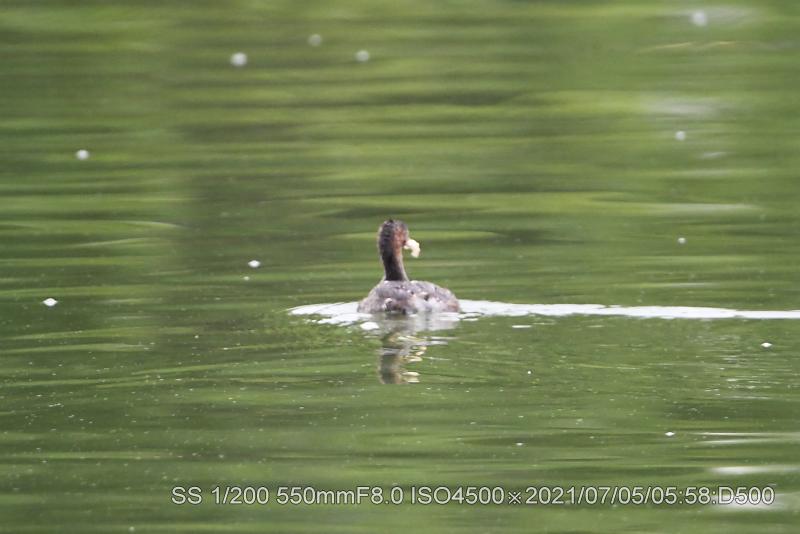 バンが魚を咥えているのを初めて見た。近くの雛に与えていた。なんせ、捕った場面は見てないがサギ類などのように上から突くのだろうか。雛は最近、東屋前に6羽が集合する場面に遭遇する。カイツブリ雛は竹輪を与えても直ぐに中央へ戻る。鯉の突き上げの恐怖があるようだ。