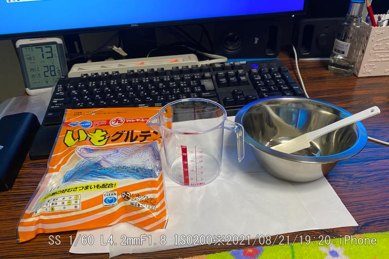 カイツブリがパンくずを撒き餌に使って小魚ゲットするので、カイツブリの餌を練り餌にしてみた。まず百均で水カップ(メモリ付き)ステンレスボウル、ヘラを購入。Amazonでいもグルテン(練り餌)を購入。水とグルテン1:1で練って、パンで巻いた。水ですぐに水没しないように。少しぐらいは魚が寄ってくれるように祈る。