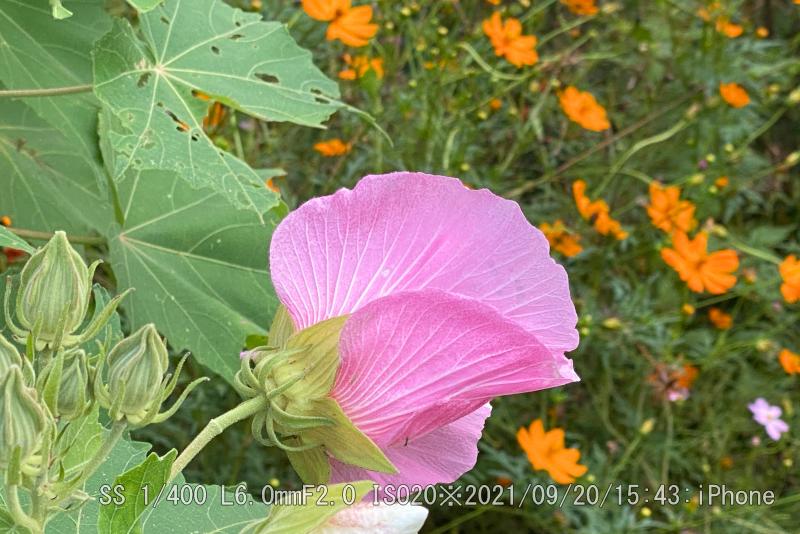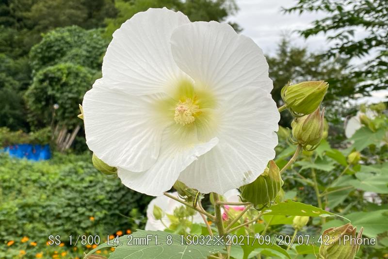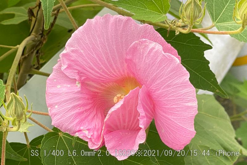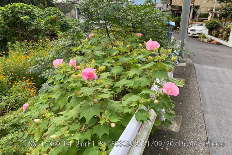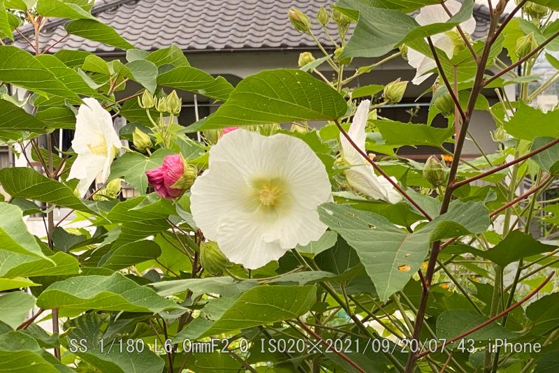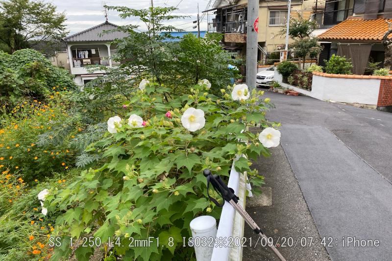 ハイキングコース民家付近の酔芙蓉が真っ盛り。蕾が未だ沢山あるが、一度に咲くことは無い。