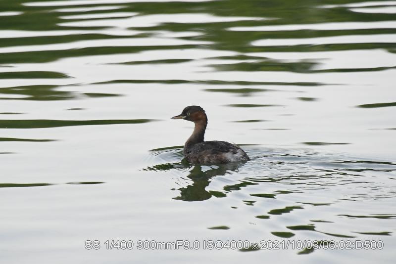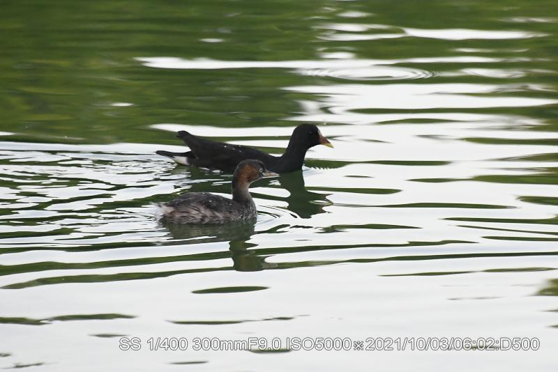 今朝は小魚ゲットならず。バンの若鶏が仲良く併走。※親鳥には追い払われる。