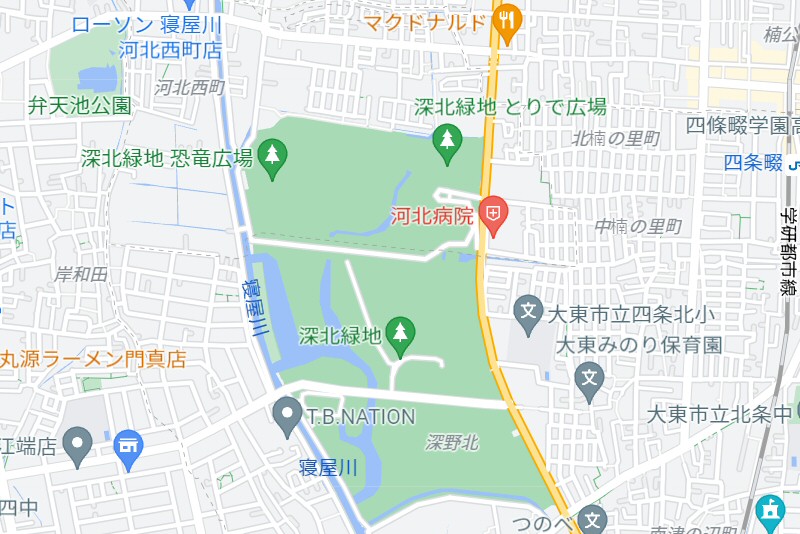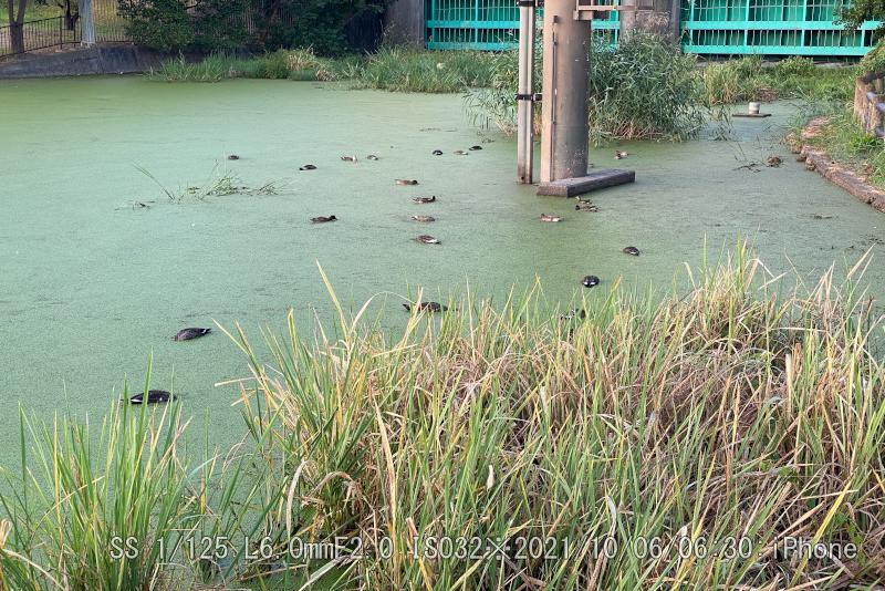 弁天池から東の方向へ飛んで行ったカルガモだろうか、深北緑地水門前辺りの池で藻を食事してた。